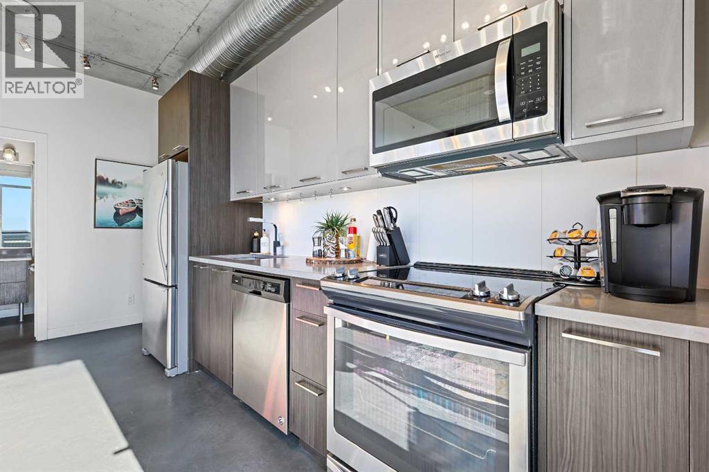 Experience modern city living at its best in this stylish 2-bedroom, 1-bath corner unit at INK by Battistella, perfectly positioned in Calgary’s vibrant East Village. Whether you’re a first-time buyer, a savvy investor, or a downsizer, this home delivers the perfect blend of bold design, intelligent functionality and unbeatable location. Perched on the 11th floor and quietly set at the end of the hall, this pet-friendly, short-term rental approved condo showcases an industrial-chic aesthetic with polished concrete floors, exposed ductwork, and soaring 9.5’ windows that fill the space with natural light. The sleek kitchen features quartz countertops, high-gloss cabinetry, and stainless-steel appliances, opening seamlessly into a bright, open living area that’s perfect for entertaining or relaxing. Two well-separated bedrooms offer versatility for a roommate setup, guest room, or home office, while the modern 4-piece bath adds a touch of everyday luxury. Step out onto your wrap-around balcony to take in breathtaking south-facing views of the Calgary Tower, Stampede Grounds, and downtown skyline—an ideal backdrop for morning coffee, evening sunsets, and Stampede fireworks. Additional perks include in-suite laundry, titled underground parking, storage locker, and impressive building amenities such as a rooftop patio, penthouse recreation room, bike storage, visitor parking, and a pet wash station. From your doorstep, enjoy easy access to the C-Train, Studio Bell, Superstore, cafés, parks, the Saddledome, and the Bow River pathways. This is your opportunity to live or invest in one of Calgary’s most dynamic and walkable urban communities. (id:55690)