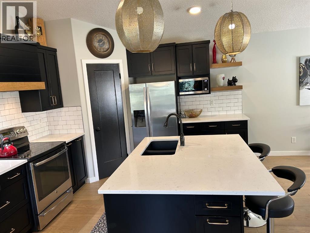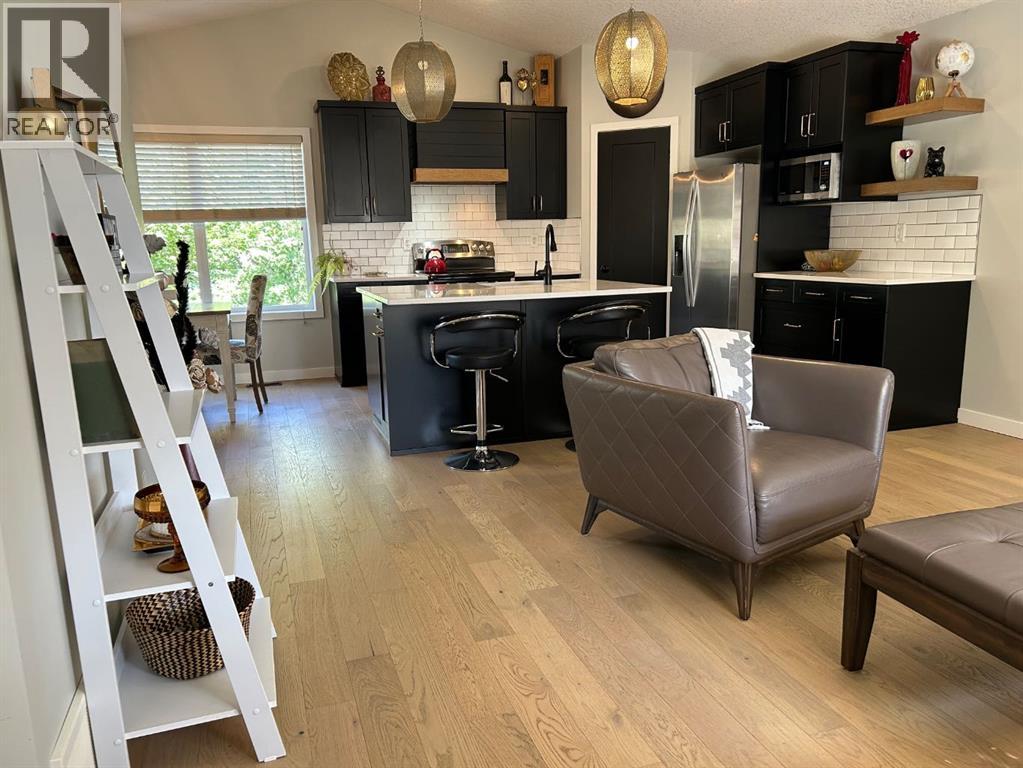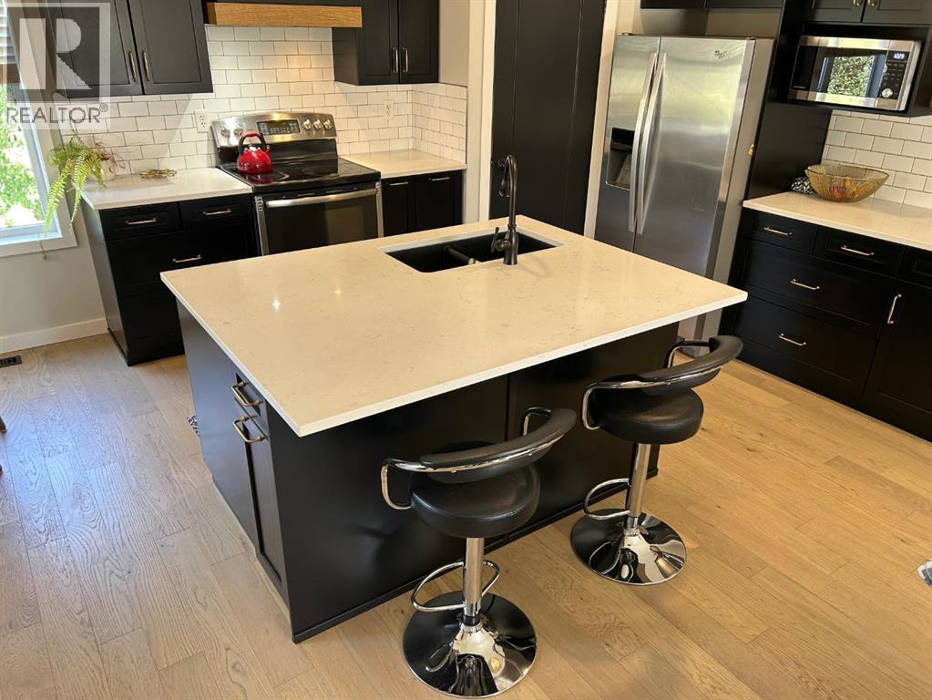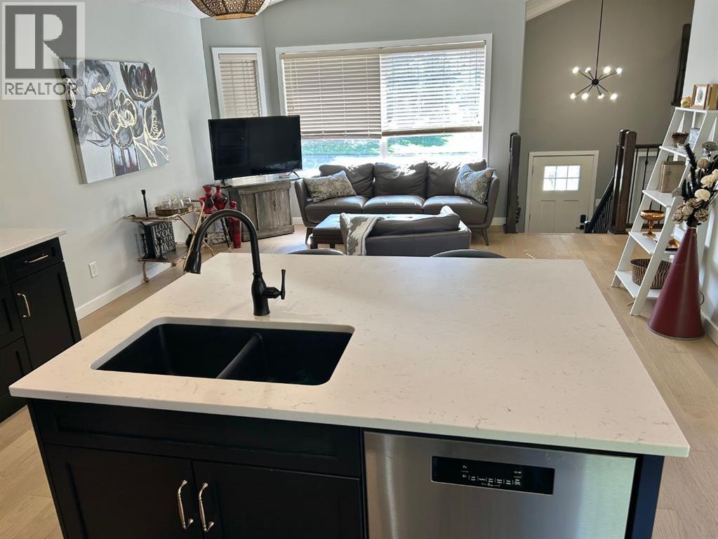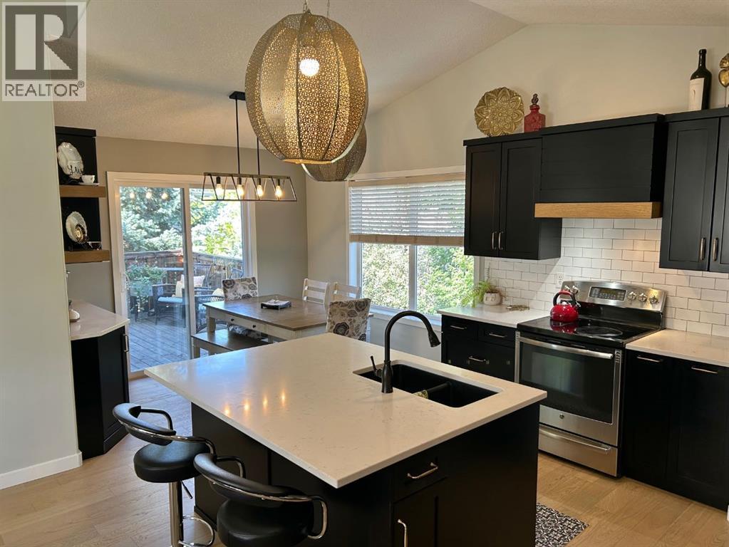 Walk-out Bilevel across from Rivermill Island Park! This dynamic 5 bedroom home offers the best of both a stylish design, and well established character. Major updating renovations were completed in 2022 including complete custom kitchen, flooring, paint, fixtures, and more. The kitchen certainly exudes a luxurious feel with the black cabinetry, white flecked quartz countertops, and gold tile accents; yet still is very functional with the oversized, low island counter height and convenient beverage bar. The yard has been developing since 2006, is well treed, tastefully landscaped, and provides a gorgeous private retreat on those hot summer days. Ascend to the primary bedroom suite that is very spacious, sports a walk-in closet with natural light, and is overlooking that island park. 2 other bedrooms on the main level, and 2 more bedrooms down gives you room for all of your clan. 3 FULL bathrooms throughout the home add to the convenience as well. A family/rec room in the lower level and true walk out access to your back yard will cater to your series binge-watching nights, hot tub sessions, and back yard BBQ's. This gem of a property could be available to move in to as early as 30 days...what are you waiting for? (id:55690)