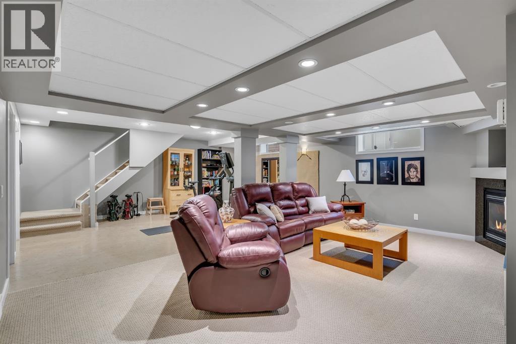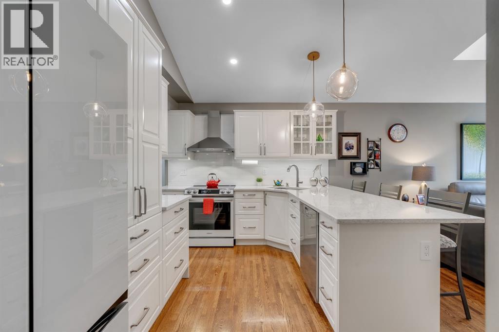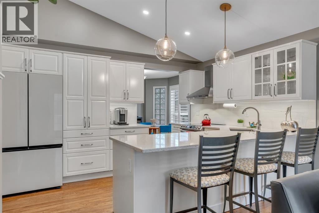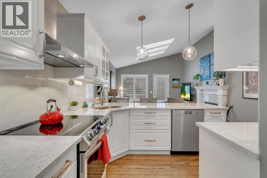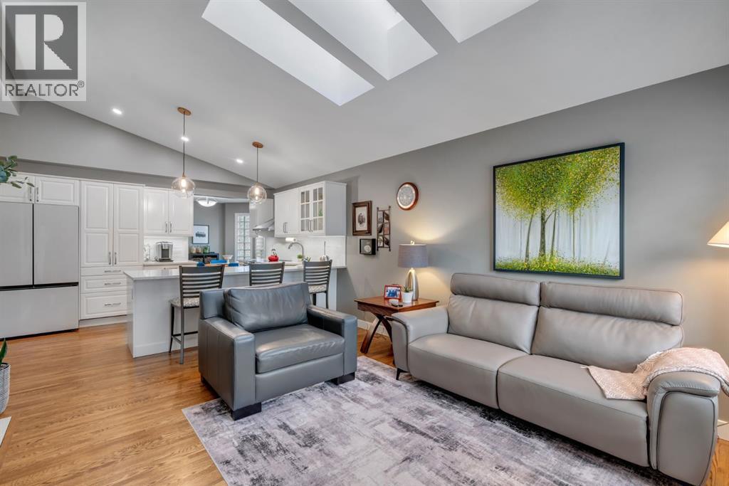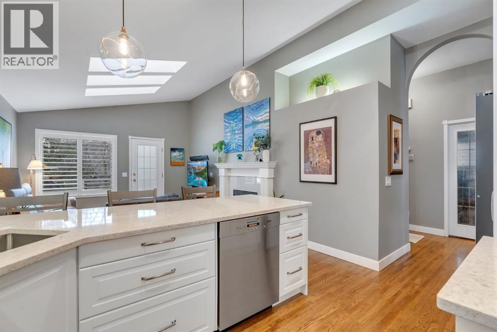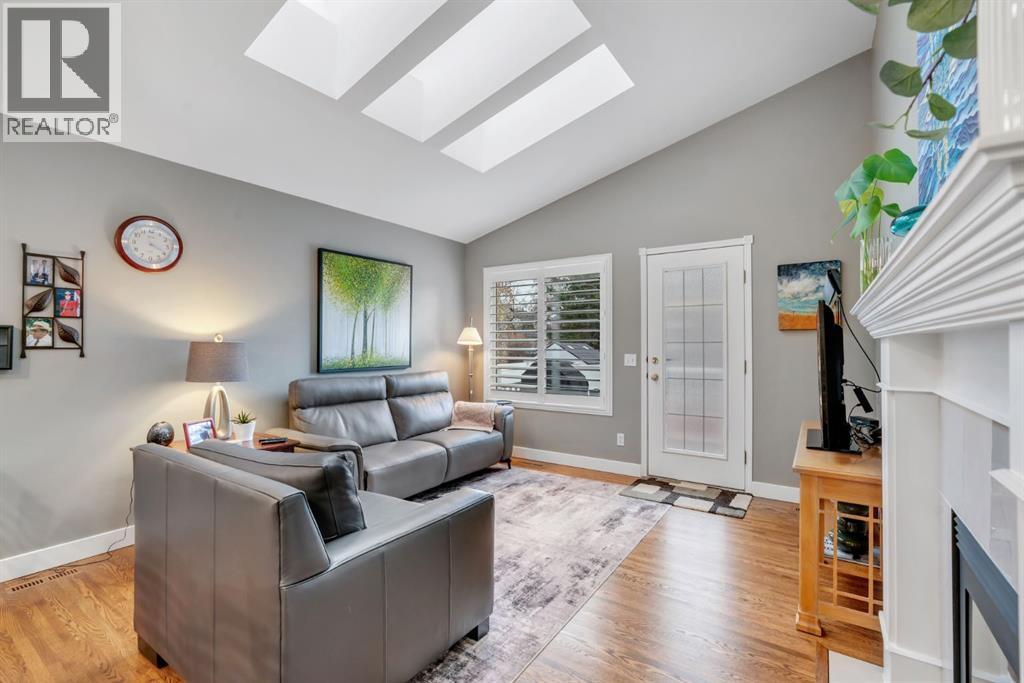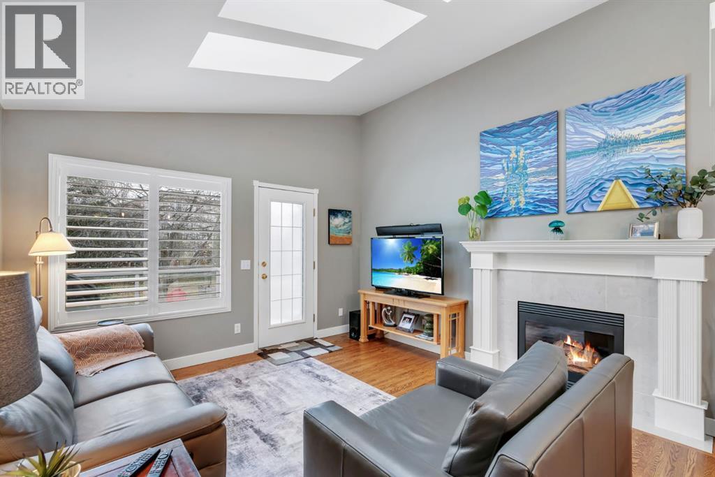 **Open house cancelled** This beautifully upgraded home backs onto greenspace with a sunny south backyard and offers bungalow style living with bonus space for guests or family. As you enter, the main level features soaring vaulted ceilings in the living and dining rooms, refinished hardwood floors throughout, and an upgraded white kitchen with quartz countertops, eating bar, under-cabinet lighting, pull-out drawers, a pantry with organizers, and a newer white glass front Samsung Bespoke fridge with beverage center and induction stove (2023) plus the nook has extra storage. The family room with skylights and beautiful gas fireplace with tile surround provides direct access to the no-maintenance deck overlooking the greenspace. The primary bedroom on the main floor offers the ultimate convenience—no stairs required—and includes a walk-in closet, updated ensuite with new shower and soaker tub and heated floors. It also provides deck access. A main floor den/office, powder room and laundry room complete this ideal layout. Upstairs, the loft is perfect for a reading area or office and the additional bedroom with walk-in closet and ensuite make the perfect private space for older kids, guests, or extended family. The developed basement adds even more versatility with two additional bedrooms (one with a built-in Murphy bed), bathroom with shower, a spacious rec room with a gas fireplace, workout area with cork flooring and plenty of storage. Additional updates and features include: air conditioning, all Poly-B replaced, California shutters, new garage door (2023), newer furnace (2019), extra-wide driveway, gas BBQ line on the deck and backyard shed. This home truly combines the ease of one level living with the flexibility of additional space — a rare and truly special find in Riverbend! Ideally located on one of the community’s best streets, it backs directly onto greenspace and is just a short walk to the Bow River pathways, Quarry Park amenities, and offers quick acce ss to Glenmore Trail and Deerfoot- don't miss out on this great home! (id:55690)