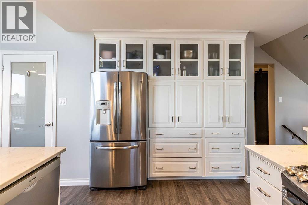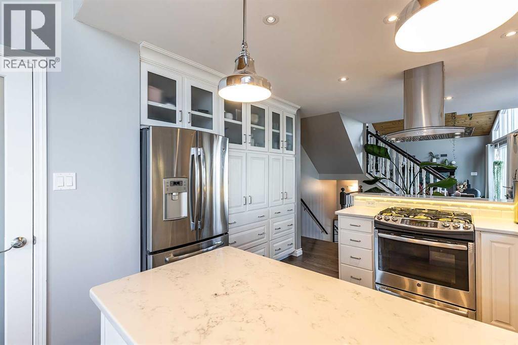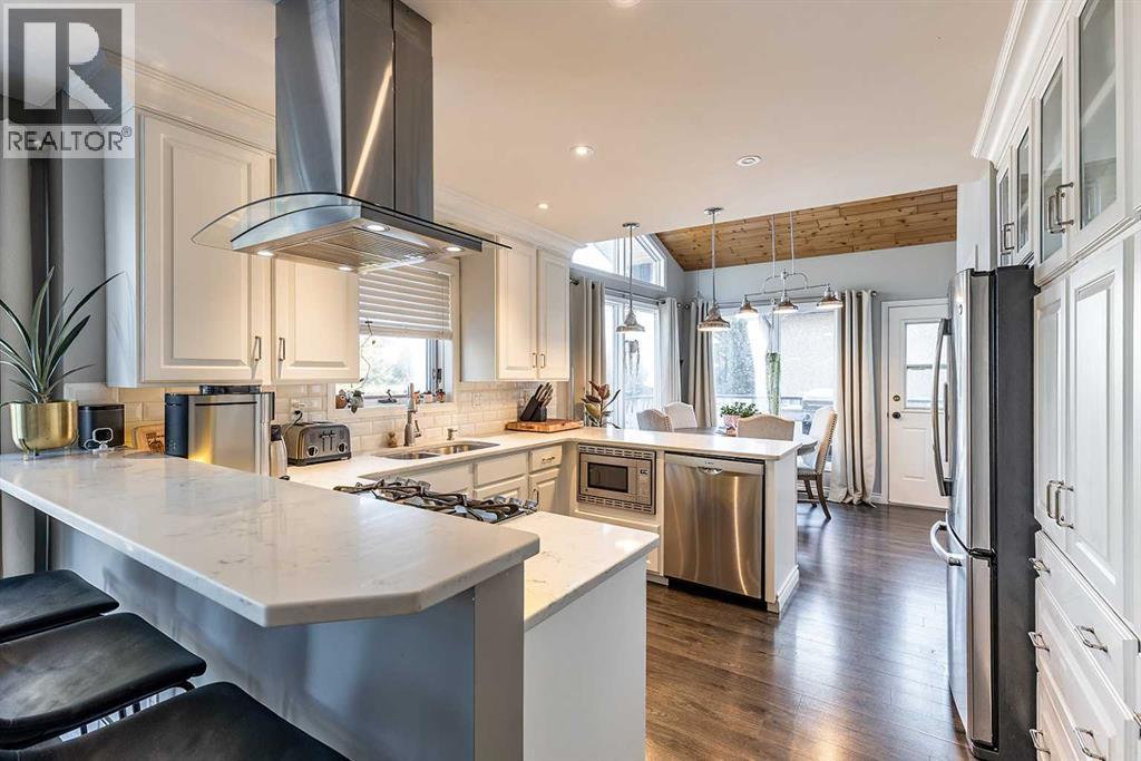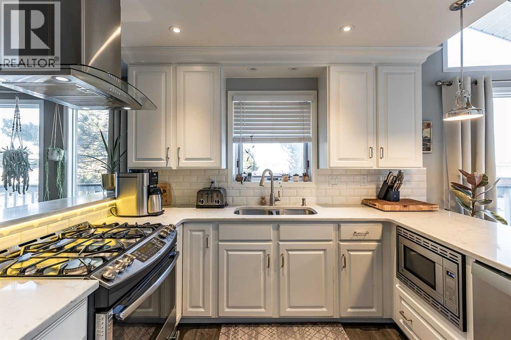 1168 16 Street NE is a truly special home, offering a rare blend of character, thoughtful updates, and an exceptional location with views of the river valley — all tucked away on a quiet, desirable street. The home’s unique design welcomes you through the front door into the lower level, where a spacious and inviting rec room/living area awaits. Functional details like built-in cabinetry, a Murphy bed, and charming wallpaper make this level incredibly versatile. Heading upstairs, the main level is nothing short of breathtaking. Vaulted cedar ceilings, expansive windows, and open sightlines flood the space with natural light and create an airy, uplifting feel. The living room is anchored by a brand new wood-burning fireplace complete with updated hearth, mantel, tile, and insert. The kitchen is elegant and seamlessly connects to the dining area, offering direct access to the large wrap-around deck where you can enjoy peaceful views and morning coffee overlooking the yard and river valley beyond. This level also features a spacious primary suite, complete with double closets and a private 3 pc ensuite. Two additional bedrooms, a beautifully updated 4 pc main bathroom, and a convenient laundry room complete this floor. Above it all, the third floor loft is a standout feature and a truly inspiring space. Bathed in natural light, it offers the perfect spot to relax by the windows and take in those gorgeous views! Whether used as a library, home office, family room, or creative retreat, the loft also includes smart built-in storage along both sides, making it just as functional as it is charming. Set on an impressive 11,800 sqft lot, the outdoor space is an absolute oasis. While winter has it resting, it’s easy to imagine how stunning and serene this yard becomes in the warmer months: mature landscaping with UGS, a peaceful pond with waterfall, relaxing hot tub, and a charming shed with electrical — all creating a private retreat rarely found in the city. Additional highl ights include solar panels, adding efficiency and long-term value, and a home layout that feels both open and intimate. Homes with this much character, space, and setting rarely come available. This is a property that must be experienced to truly appreciate its warmth, charm, and timeless design. (id:55690)