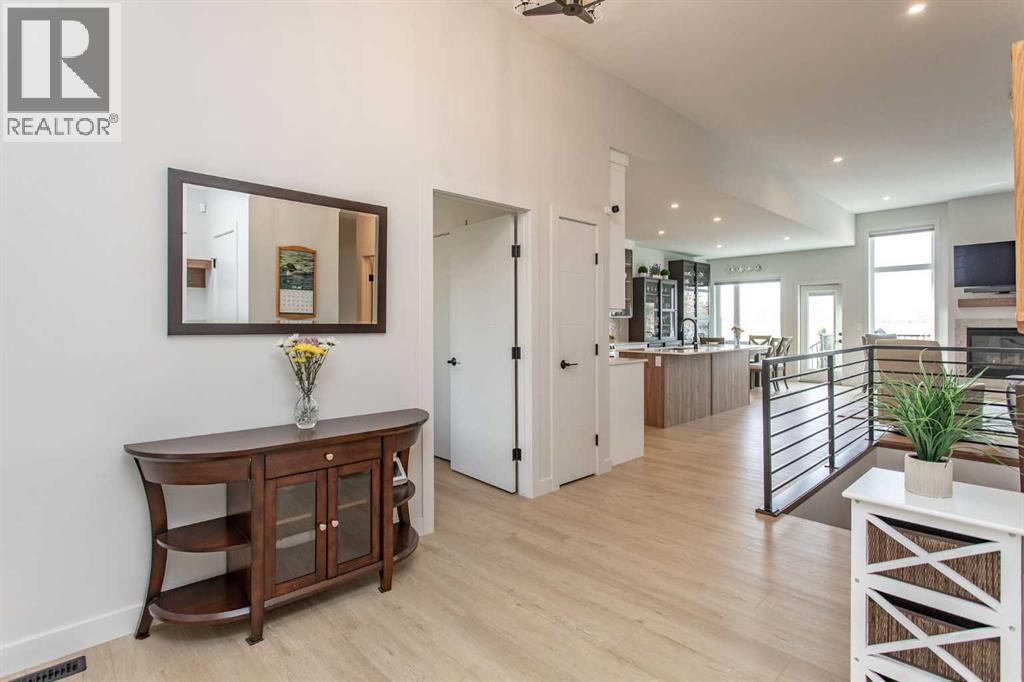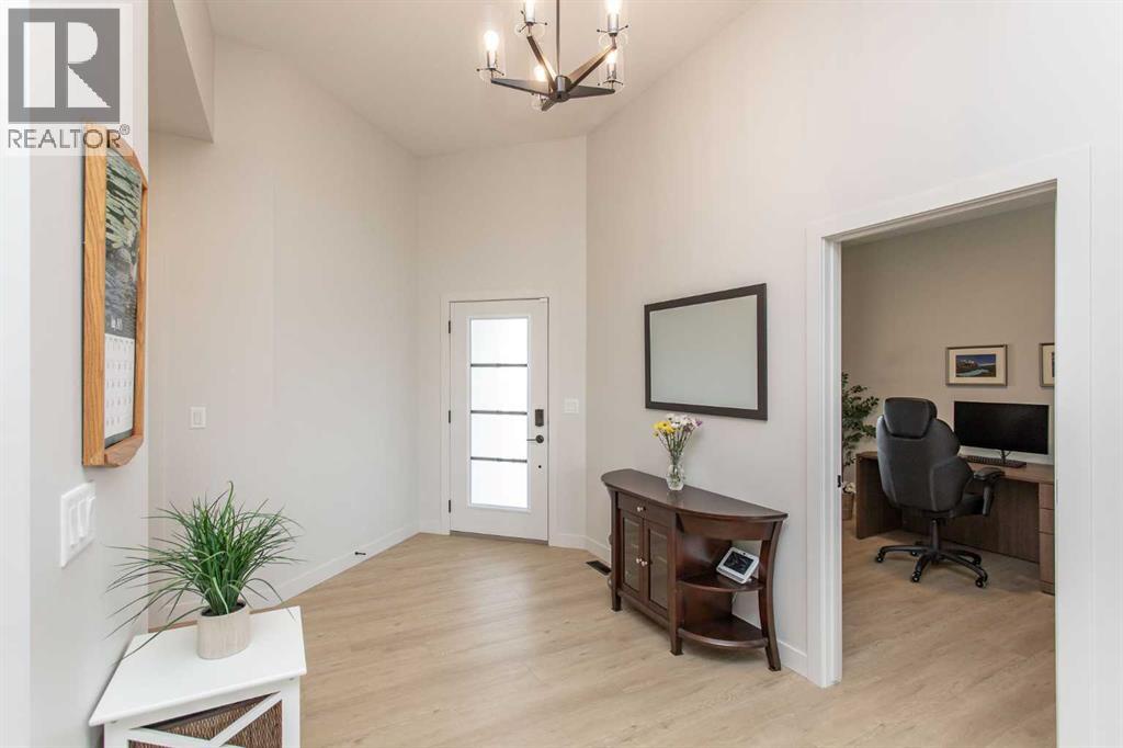 Explore this exquisite and spacious executive bungalow, featuring a three-car garage crafted by True-Line Homes. This residence showcases a unique layout that the builder has designed for the first time. Situated in the picturesque Evergreen neighborhood, this beautiful home presents an expansive open floor plan with soaring 11-foot ceilings and an abundance of south-facing windows, flooding the interior with natural light.As you step through the front door into the generous foyer, you'll immediately notice its convenient dual access with the entrance to the garage. This intelligently designed space includes a large foyer, a spacious closet, and custom shelving.The modern chef's kitchen is a culinary delight, boasting high-end appliances, ample cabinet and countertop space, and an impressive 8.5-foot island. Luxurious finishes include Quartz countertops, a Franke peak undermount granite double bowl sink, and a walk-in pantry with custom shelving for abundant storage. Attention to detail shines through with a custom wood range hood stained to match the island and stylish glass cabinet shelving.On the main floor, there's a versatile den currently utilized as an office, which could easily serve as a fourth bedroom. The spacious primary suite features a five-piece ensuite and a generously sized custom walk-in closet, expertly designed by Canadian Closet. An additional highlight is the expansive laundry room equipped with custom cabinetry and countertops, along with a pass-through window from the walk-in closet. This laundry space houses the LG 6.0 cu. ft. mega capacity Wi-Fi enabled front-load washer with the LG Sidekick mini washer in the pedestal along with a matching 9.0 cu. ft. dryer. Lastly, a two-piece powder room completes the main level.Descend the extra-wide stairs to the cozy family room, equipped with in-floor heating, ideal for movie nights or family game sessions. This level also includes two spacious bedrooms and a full four-piece bathroom, all enjoying the comfort of in-floor heating. The large storage area features durable painted floors, offering potential for an additional bedroom.This home boasts numerous upgrades, including a low-maintenance front verandah and a 10' x 18' back deck, central air conditioning, a water softener system, SunStop Low E argon-filled windows, and a fully finished heated triple garage with an epoxy-coated floor and two dry sumps. Custom Hunter Douglas blinds are fitted throughout, with motorized options in the living room, office, and primary bedroom.The professionally landscaped front and back yards feature stone elements and raised flower beds, enhancing the home's curb appeal. The Evergreen neighborhood offers extensive multi-use trails connecting to Red Deer’s extensive trail system, as well as two ponds with unique bridges and large playground and park facilities. Come and discover the elegance and comfort this remarkable property has to offer! (id:55690)