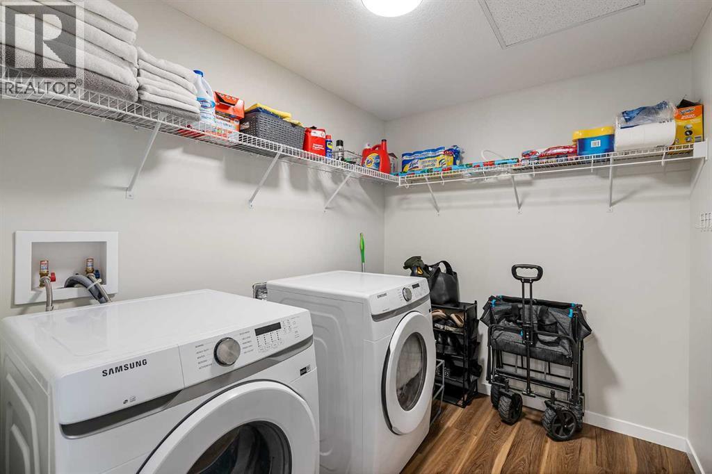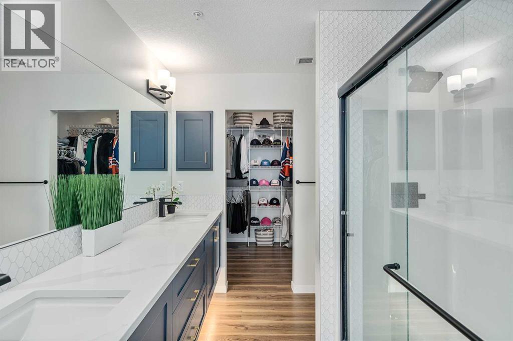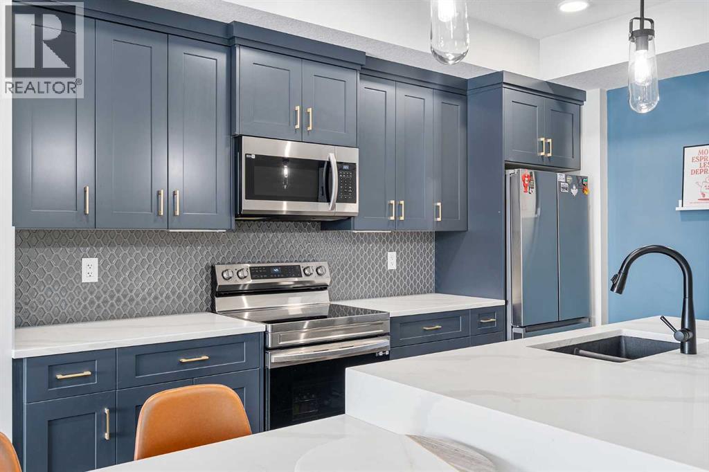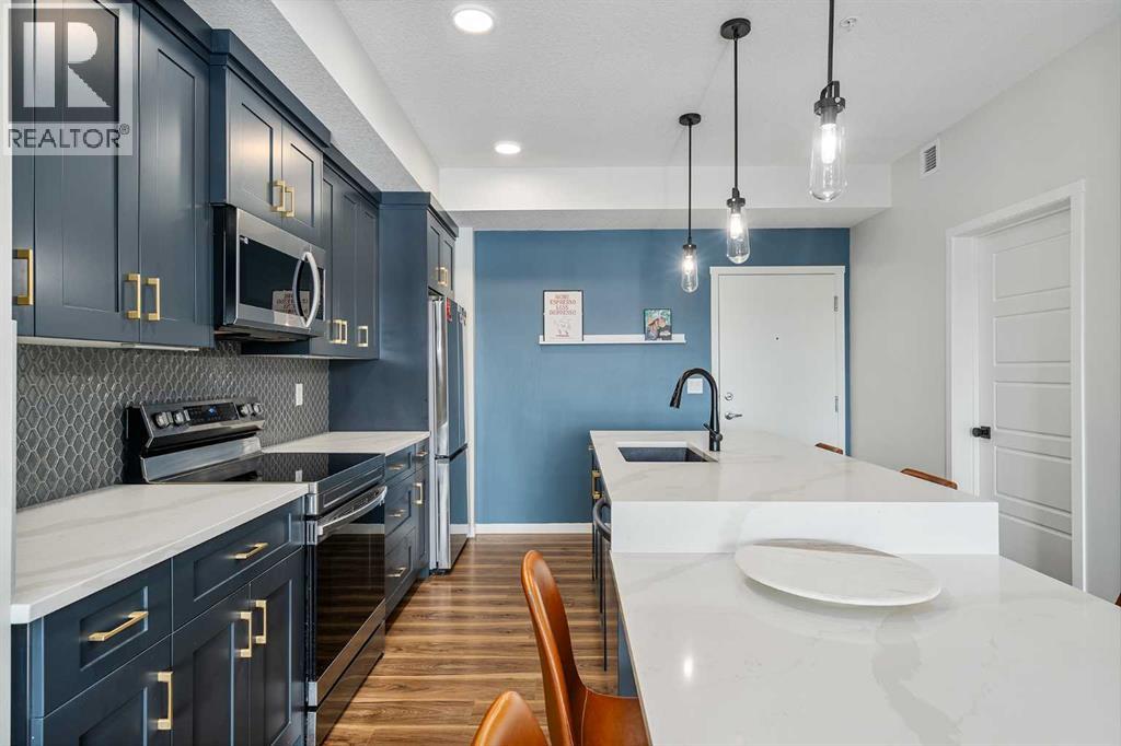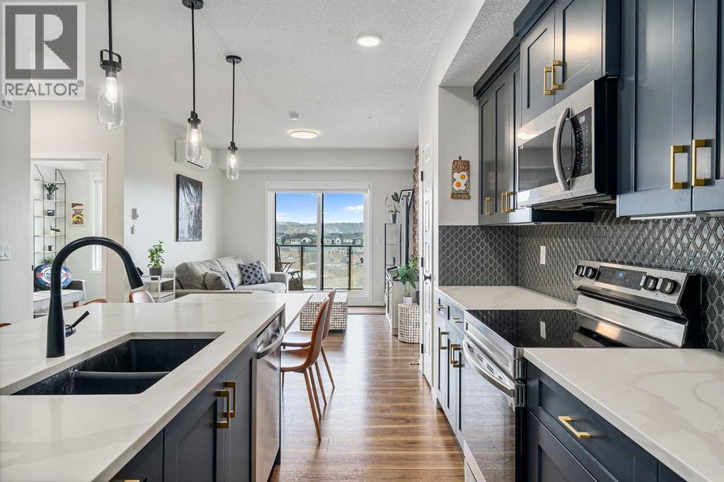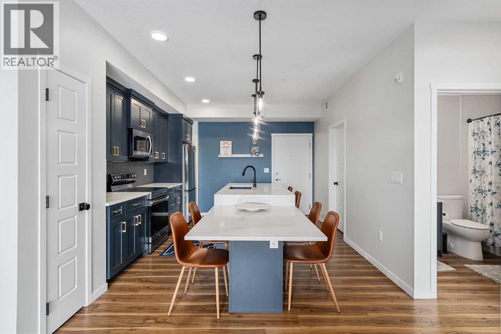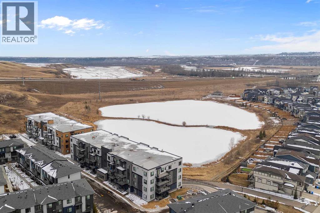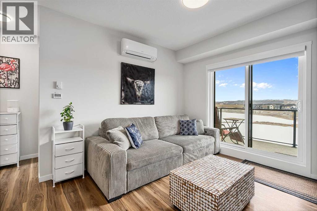 Welcome to this beautifully upgraded 2-bedroom, 2-bathroom condo in Cranston’s desirable Riverstone, offering the perfect blend of modern living and natural surroundings. Located on the 3rd floor with south-facing exposure, this bright and thoughtfully designed unit features peaceful pond views and is just steps from the Bow River pathways, making it an ideal choice for those who value both comfort and lifestyle.Built in 2023, this home showcases luxury vinyl plank flooring throughout and an open-concept layout filled with natural light. The stylish kitchen highlights over $20,000 in builder upgrades, including full-height two-tone cabinetry with gold hardware, quartz countertops, stainless steel appliances, and a functional island with built-in dining space. The living area opens onto a private balcony with a gas line for BBQ, perfect for enjoying summer evenings with a scenic backdrop. Air conditioning ensures year-round comfort.The primary bedroom offers a relaxing retreat with a spa-inspired ensuite featuring a floating dual vanity and a spacious walk-in closet. The second bedroom is well-sized and also includes its own walk-in closet, a rare and valuable feature. A second full bathroom, along with a dedicated in-suite laundry room with additional storage, adds everyday convenience.This unit includes a titled underground parking stall and a separate storage locker conveniently located on the main floor. Condo fees of $357/month cover common area maintenance, building insurance, and water. An annual HOA fee of $518 provides access to Cranston’s outstanding amenities, including Century Hall, a 7.5-acre park, splash park, skating rink, sports courts, and year-round community programming.Situated in one of Calgary’s most established and sought-after communities, Cranston offers nearly 400 acres of green space, a peaceful and fully developed environment with no ongoing construction, and unbeatable access to the Seton Urban District, South Health Campus, YMCA, shopping, dining, and more.With its modern design, premium upgrades, incredible location, and connection to nature, this home is a fantastic opportunity for first-time buyers, downsizers, or investors alike. Book your private showing today and experience it for yourself. (id:55690)