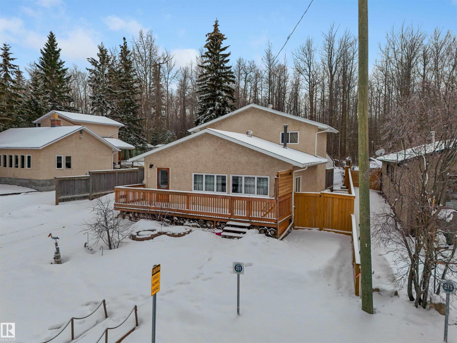 Welcome to Crystal Springs on the south shore of Pigeon Lake, offering the perfect opportunity for lake living this year. Enjoy easy access to the shared waterfront pier, playground, and picnic area, all while retreating to a remarkably private backyard that backs onto a treed reserve. This 1.5-storey, year-round home blends classic log charm (originally built in 1938) with a modern addition, featuring a spacious kitchen and dining area, three bedrooms, and a convenient laundry/bath. The covered, south-facing deck is ideal for entertaining or relaxing in the sun. The backyard is designed for quiet enjoyment, complete with a large firepit area for evening gatherings. An oversized storage building provides plenty of space for lake toys or could be converted into a bunkhouse for guests. Well maintained, affordable, and ready to enjoy—your lake escape awaits. New items include stainless appliances, bathroom vanity, toilet & fixtures, pressure tank and hot water tank, well pump, exterior doors and front deck! (id:55690)