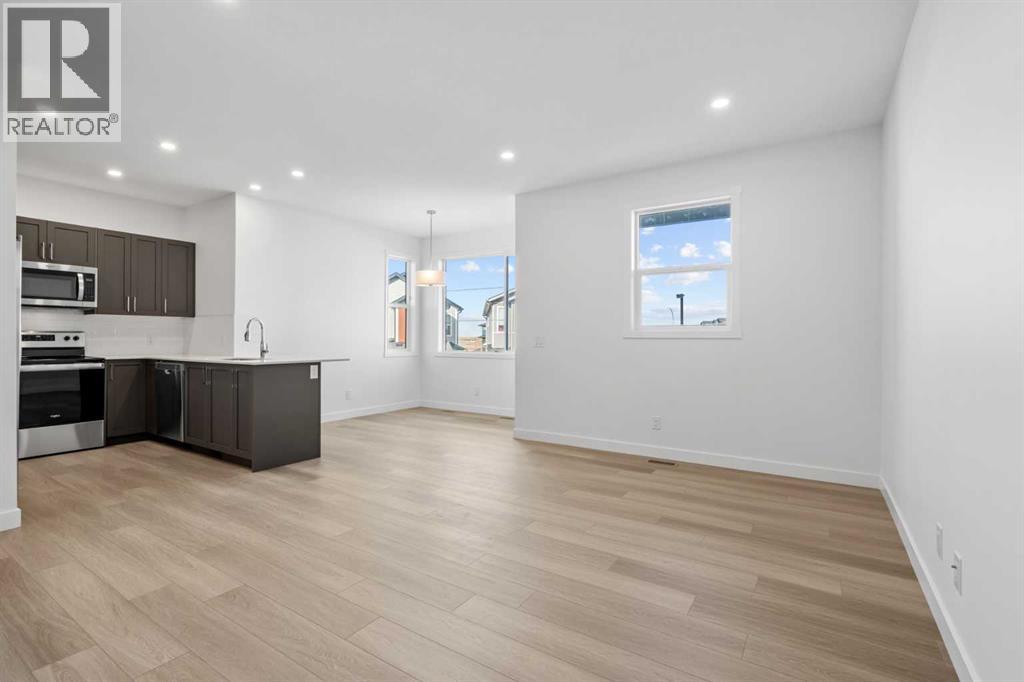 NEW BUILD 3-STOREY TOWNHOME | END UNIT NEAR GREEN SPACE | LOW CONDO FEES | 3 BED / 3.5 BATH / 1544 SQ FT | SINGLE ATTACHED GARAGE | Welcome to the Townsend 1 by Minto Communities, an award-winning Canadian builder for over 70 years! Belvedere Rise offers an intimate collection of just 56 thoughtfully designed townhomes located in the growing community of Belvedere, steps from East Hills Shopping Centre. This end-unit home offers added privacy and is ideally positioned near green space, combining modern design, everyday convenience, and excellent value for families and professionals alike.The main living level showcases a bright and functional layout designed for both comfort and entertaining. The kitchen is well-appointed with a pantry, stainless steel appliances, and peninsula counter space, seamlessly connecting to the dining area located at the front of the home with direct access to a private balcony. Adjacent to the kitchen and dining area is a spacious living room featuring an additional flex space, ideal for a home office, reading nook, or play area. A convenient 2-piece bathroom completes this level.Upstairs, the upper floor is designed with privacy and functionality in mind. The spacious primary bedroom features a walk-in closet along with a 4-piece ensuite. The second bedroom also includes a walk-in closet and is serviced by another separate full bathroom. Upper-floor laundry adds everyday convenience and completes this well-planned level.The ground floor offers a large welcoming entryway, a third bedroom, and a 3-piece bathroom—ideal for guests, a home office, or multi-generational living. This level also provides direct access to the single attached garage, keeping daily routines simple and efficient.Belvedere Rise fosters a true sense of community with its pedestrian pathways, nearby greenspace, and intimate scale, creating an environment where neighbours can easily connect. Located just steps from East Hills Shopping Centre, residents enjoy unmatc hed walkability to Costco, Walmart, banks, restaurants, and everyday essentials—all just across the street. With quick access to major roadways and public transit, commuting downtown or around the city is effortless.Combining modern finishes, a functional three-storey layout, low condo fees, and an unbeatable location, this is a fantastic opportunity to secure a brand-new townhome in one of southeast Calgary’s most convenient communities. Contact Minto’s sales staff and book your visit today! (id:55690)