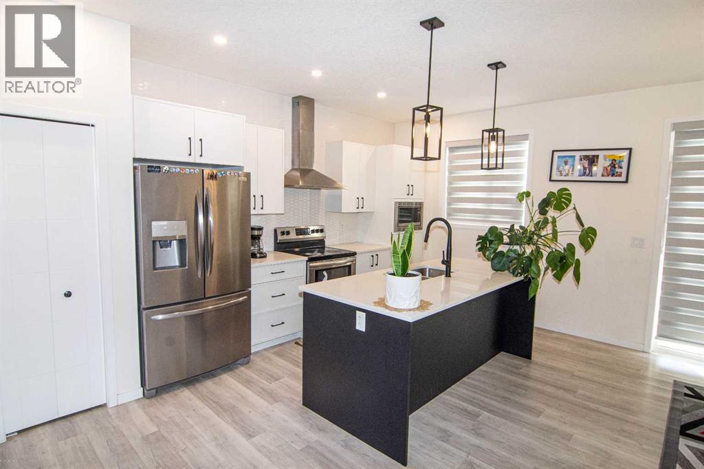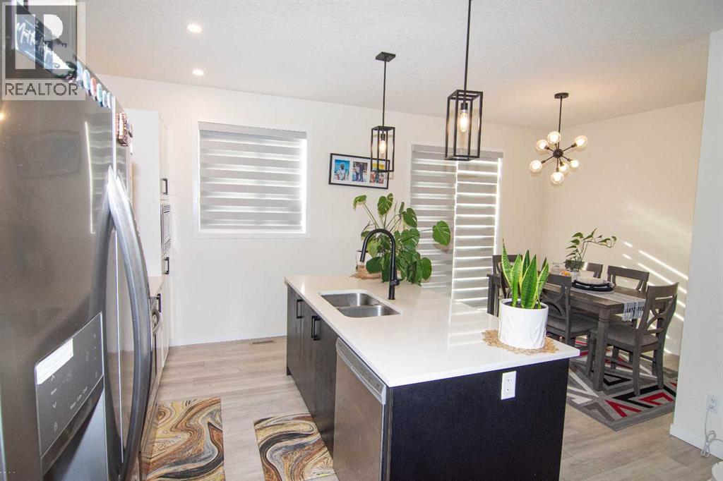 Welcome to this impeccably maintained townhouse in the highly sought-after SouthPoint Park community of SW Airdrie. Offering 3 bedrooms, 2.5 bathrooms, and a versatile lower-level flex space, this residence seamlessly blends modern style, thoughtful design, and everyday comfort.Step inside to a bright, open-concept layout designed for both functionality and elegance. The lower level features a spacious flex area—ideal for a home office, fitness studio, media room, or play space—providing flexibility to suit your lifestyle needs.The main level showcases beautiful vinyl plank flooring throughout and an effortless flow between living spaces. At the heart of the home is a stunning white kitchen accented with striking black finishes. Designed with both form and function in mind, it features a generous centre island, sleek stainless steel appliances, quartz countertops, and a dramatic full-height tile backsplash. Ample cabinetry and counter space make this kitchen perfect for everyday living and hosting gatherings alike.Across from the kitchen is a spacious dining area with direct access to a private balcony—an inviting extension of your living space. Adjacent, the comfortable and well-proportioned living room offers the perfect setting to relax or entertain. A convenient powder room completes this level.On the upper level, the primary suite provides a private retreat, complete with a 3-piece ensuite. Two additional well-sized bedrooms, a full bathroom, and the convenience of upper-level laundry complete the upper floor.The attached double garage offers both practicality and additional storage, while the spacious balcony creates an ideal outdoor escape for morning coffee or evening relaxation.Ideally located just steps from schools, playgrounds, and everyday amenities, this home presents an exceptional opportunity for families and modern buyers alike. With its strategic location, thoughtful layout, and outstanding value, this turnkey residence delivers comfort , convenience, and lifestyle in one exceptional package.Don’t miss your chance to make this property your own — schedule a private showing or connect for early access today!??? (id:55690)