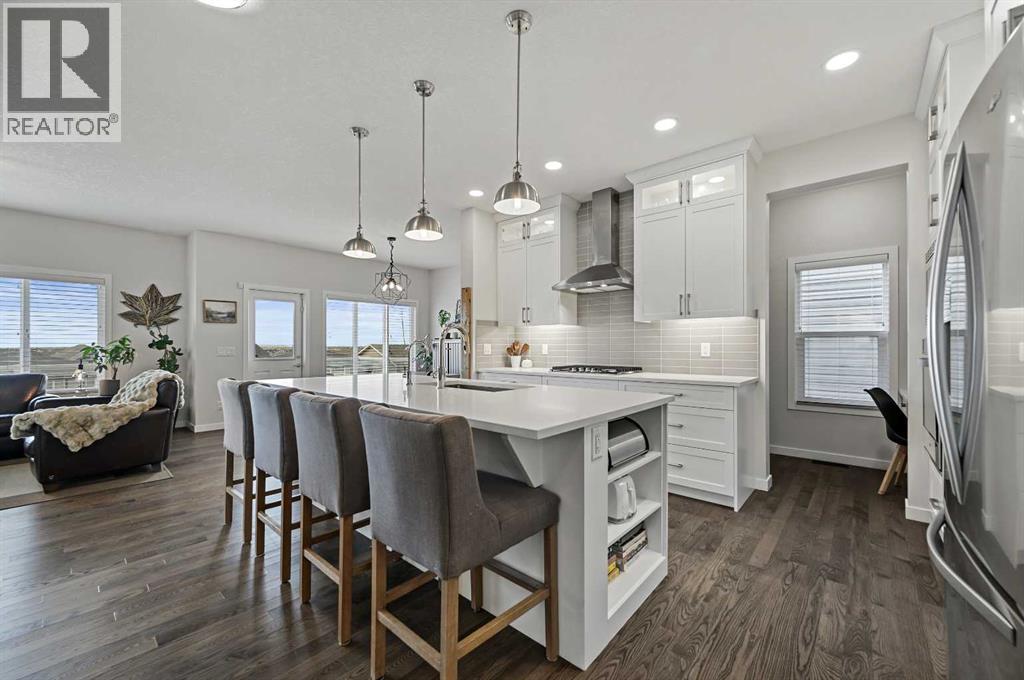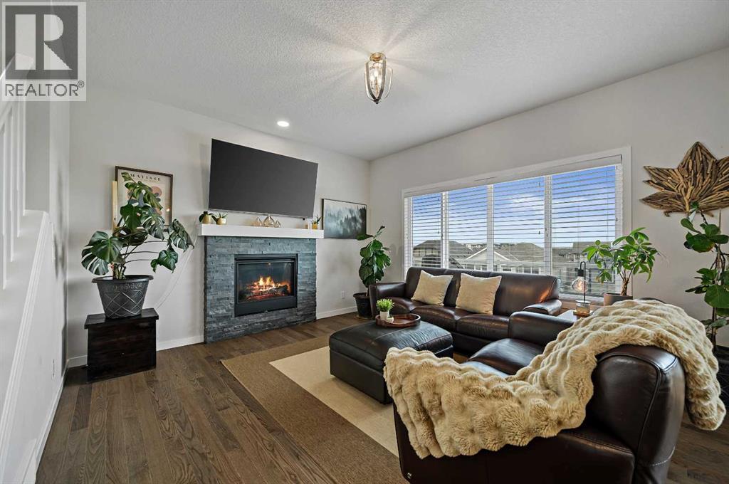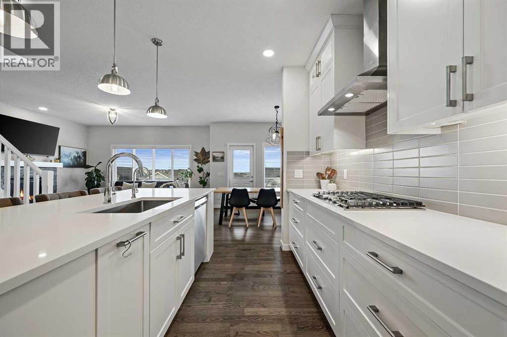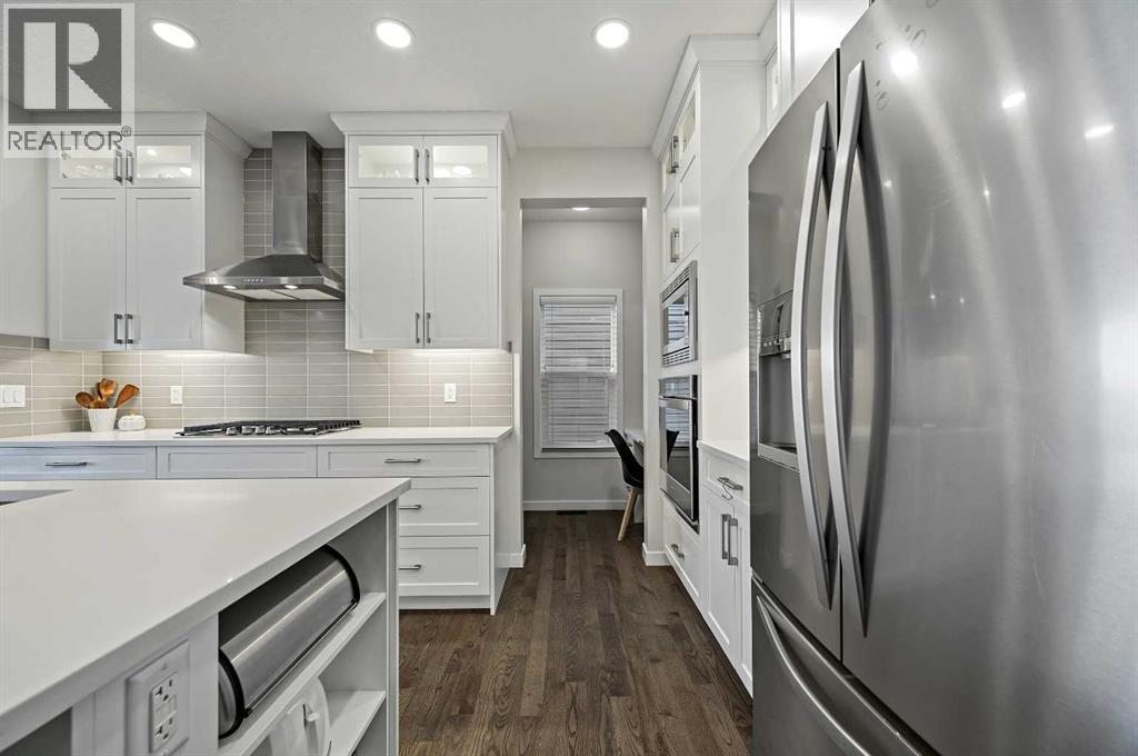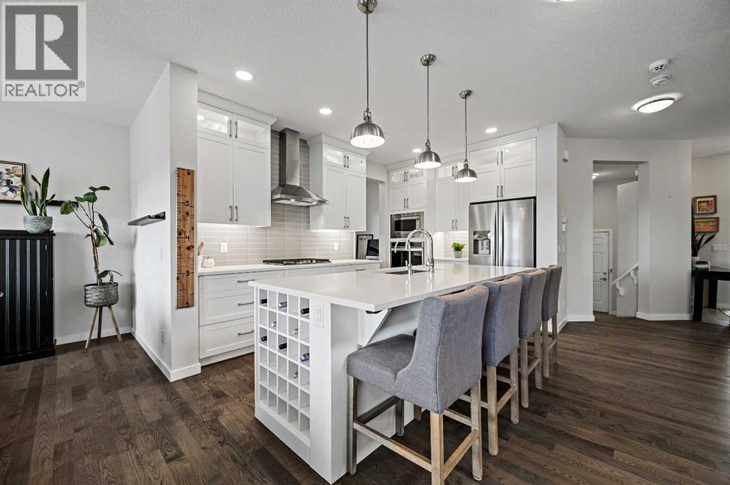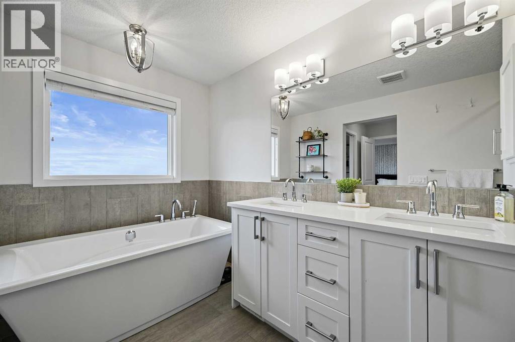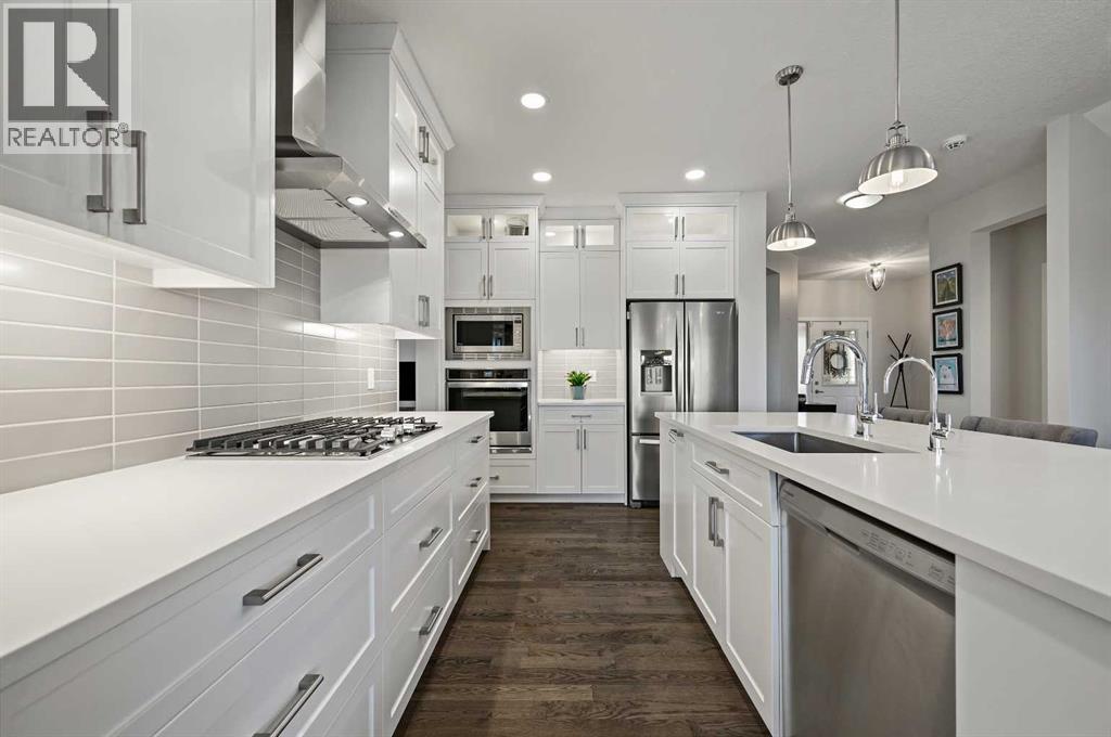 Luxury living meets everyday functionality in this extensively upgraded 5-bedroom, 4-bathroom modern two-storey WALK-OUT, TRIPLE GARAGE home backing directly onto pathways, no "fish bowl" here! You even get some beautiful MOUNTAIN views!Offering 3,384 sqft of total developed living space on a 4,724 sqft WALK-OUT lot, this Hillcrest home combines thoughtful design with premium finishes throughout.The main floor features 9’ ceilings, designer lighting, and a striking stone-surround gas fireplace. The chef-inspired kitchen is a showpiece with a massive flush quartz island with built-in wine storage and seating for four, full-height cabinetry with glass upper doors including accent lighting and under-cabinet lighting, farmhouse under-mount stainless steel sink, gas cooktop stove, built-in wall oven and microwave, chimney-style hood fan, tile backsplash, and a large pantry. A tucked-away tech space/drop zone behind the kitchen offers the perfect homework or work-from-home station. The sunk-in mudroom includes built-in lockers and bench seating for organized family living.Upstairs you’ll find four bedrooms — ALL with WALK-IN CLOSETS — plus a large central bonus room with VAULTED ceilings, ideal for family movie nights or a kids’ retreat. The spacious primary suite features a TRAY ceiling, separate recessed (dimmable) pot lights and large walk-in closet with built-ins. The luxurious 5-piece ensuite offers dual sinks with a raised vanity, standalone soaker tub, and a fully tiled shower with additional wand/control. A second 5-piece bathroom serves the additional bedrooms with a separate pocket door to the tub/shower and toilet for added convenience and functionality.The fully developed walk-out basement offers a large recreation area, fifth bedroom, 4pc bathroom, 2 storage rooms and direct access to the recently landscaped backyard that opens seamlessly to the pathway system leading to multiple parks, schools, shopping and more! The large upper deck finished in Dura dek gives the bottom stone patio coverage for those rainy spring days ahead.Enjoy the elevated glass-panel deck finished with duradek, has a BBQ gas line and unobstructed views overlooking the green space. The TRIPLE tandem garage provides exceptional parking, storage, and workspace flexibility.Additional upgrades include: Dual-zone high-efficiency furnace, high-efficiency water heater, reverse osmosis system, water softener and load management system to meet all current required codes.Located close to schools, parks, playgrounds, pathways, shopping, restaurants, and medical services — this exceptional Airdrie WALK-OUT home delivers space, storage, privacy, and refined comfort in one of the city’s most desirable family communities. (id:55690)