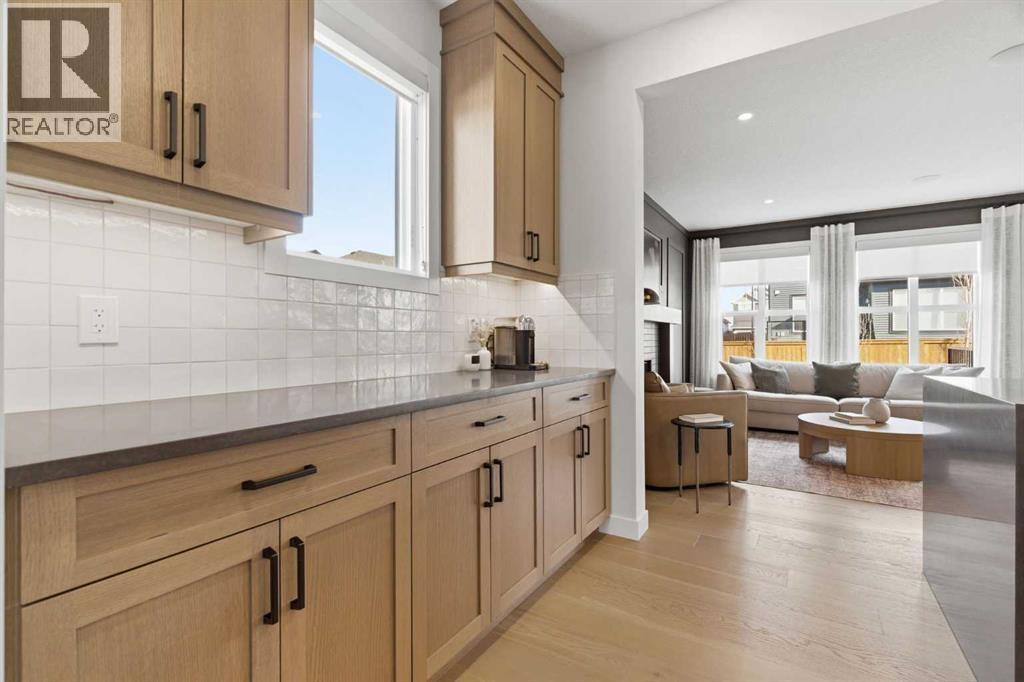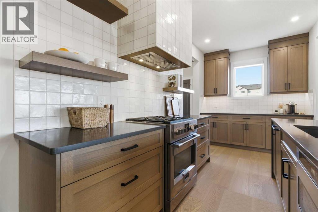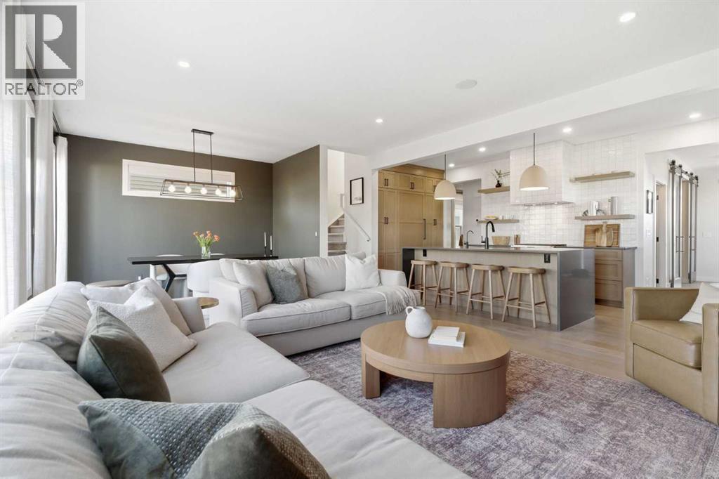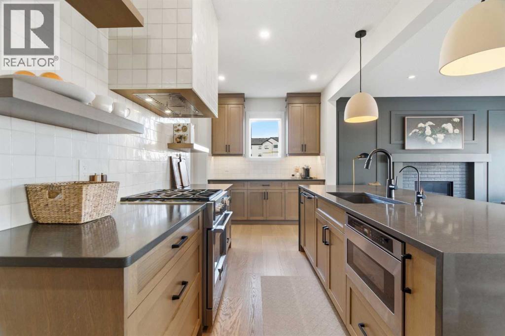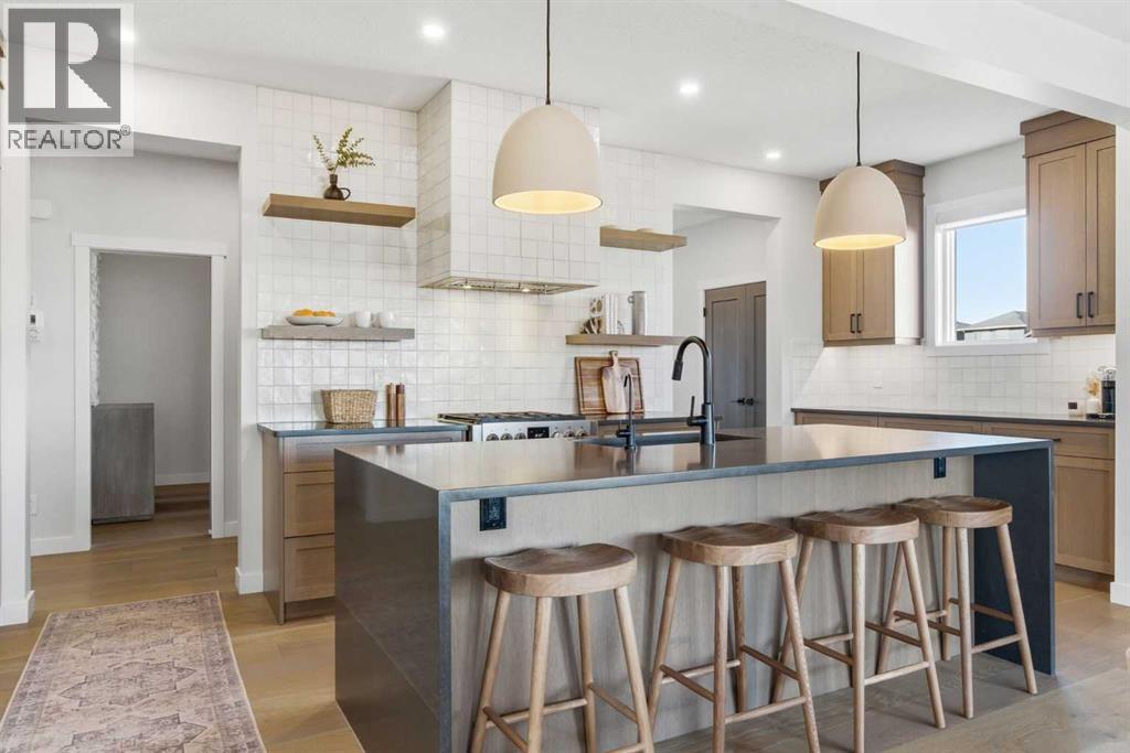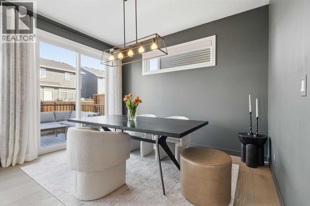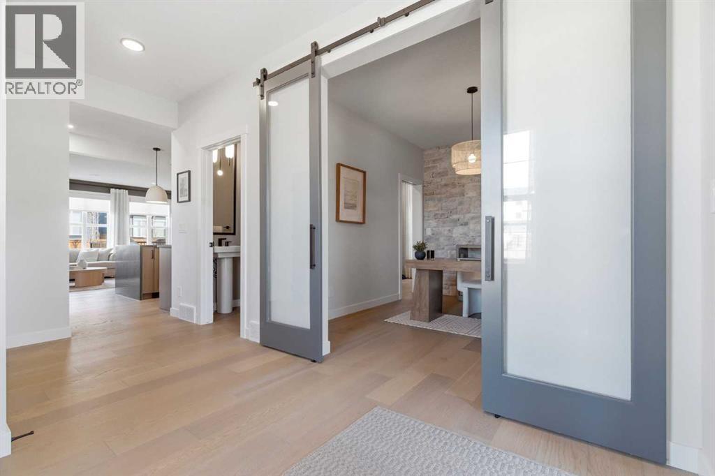 4 BEDROOMS | 3 1/2 BATHROOMS | 2-STOREY | 3,600+ SQFT OF LIVING SPACE | DOUBLE ATTACHED GARAGE | FULLY DEVELOPED BASEMENT | CORNER LOT | Welcome to this stunning Trico-built former showhome located in the sought-after community of Sirocco at Pine Creek, offering over 3,600 sqft of beautifully finished living space with 4 bedrooms and 3.5 bathrooms. Situated on a corner lot, this home is loaded with high-end upgrades and thoughtfully designed for both everyday living and entertaining. As you enter the home, you are greeted by soaring 9-foot ceilings and rich white oak hardwood flooring that flows throughout the main level. The bright and inviting living room features a gas fireplace and elegant decorative wall paneling, creating a warm and refined space to gather. Just off the foyer, a versatile flex room with a glass barn door and striking stone feature wall provides the perfect space for a home office or formal dining room. The heart of the home is the designer kitchen, showcasing white oak cabinetry with integrated appliances, including a hidden fridge and dishwasher, high-end gas range, built-in microwave, and a statement backsplash. Quartz countertops with rounded edges, a large island with waterfall edge and flush eating bar, and full-height cabinetry with crown moulding complete this stunning space. The adjacent dining area opens onto the rear deck and fully fenced landscaped backyard with a stone patio and built-in fire pit - the perfect place for entertaining. A walkthrough butler’s pantry leads to the mudroom with built-in lockers and convenient access to the double attached garage. Upstairs, you’ll find a spacious bonus room with tray ceilings and large windows, along with a convenient study nook. The luxurious primary retreat features a statement stone feature wall, a large walk-in closet with direct access to the laundry room, and a spa-inspired 5-piece ensuite with dual vanities, soaker tub, and a glass shower with bench. Two additional bedrooms, each with their own walk-in closet, and a full 4-piece bathroom complete this level. The fully developed basement with 9-foot ceilings offers even more living space, including a large recreation room with play area, a fourth bedroom, and a full bathroom, making it ideal for guests or a growing family. Additional upgrades include central air conditioning, built-in sound system on the main floor and basement, CAT5 wiring, electronic blinds, and sump pump. Located close to parks, playgrounds, and pathways, this exceptional home offers luxury, space, and functionality in one of Calgary’s newest and most desirable communities. Book your showing today! (id:55690)