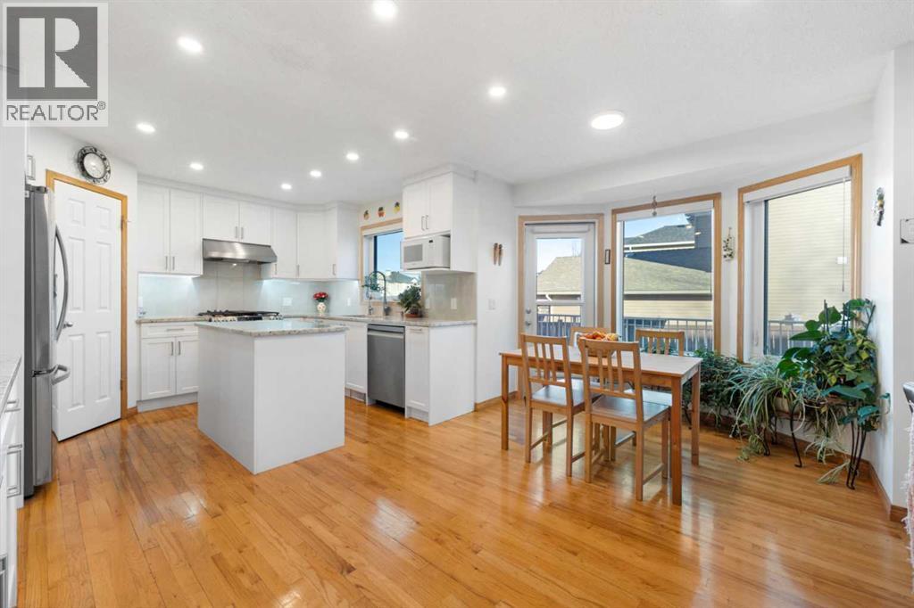 This exceptional home showcases a wide range of upgrades, including central air conditioning, triple-glazed windows, Hardie Board siding, a newer roof, top-of-the-line windows covering, and a premium Vent-A-Hood fan—just to name a few. With so many enhancements, this home truly must be experienced in person to fully appreciate its quality, design, and craftsmanship. The main floor features a bright, open-concept layout with a centrally positioned chef-inspired kitchen, a welcoming front formal living room, and a stunning family living room with soaring high ceilings, a spacious dining area, and a sun-filled breakfast nook overlooking the backyard. The kitchen is beautifully appointed with quartz countertops, a gas stove, premium stainless steel appliances, a pantry, and elegant lighting, including newly added pot lights. A main floor office/den adds flexibility for work or study. Upstairs, you’ll find three generously sized bedrooms, including a spacious primary retreat featuring a sunny southeast-facing bay window, a large walk-in closet, and a renovated 4-piece ensuite complete with a soaker tub and a separate standing shower. Two additional well-sized bedrooms and another full bathroom complete the upper level. As you move through the home, the soaring ceilings and abundance of windows create a bright and airy atmosphere filled with natural light. The fully renovated basement offers incredible additional living space, featuring a kitchenette/bar area, a spacious bedroom, and a full bathroom with direct access from the bedroom, allowing it to function as a private ensuite—perfect for guests or teenagers seeking their own space. The large recreation area is ideal for entertaining, and the ample built-in cabinetry provides excellent storage solutions. The home sits on a corner lot, allowing for abundant sunlight throughout the day. The beautiful southeast-facing backyard offers the potential to add an RV parking pad and features a durable Duradek, perfect for low-ma intenance outdoor enjoyment. The current owners have meticulously maintained the home and invested approximately $215,000 in renovations, reflecting pride of ownership throughout. Located in a highly desirable area, this home falls within the school bus zones for Tom Baines School (Junior High) and Edgemont School (K–5), with Sir Winston Churchill High School as the designated high school—one of the most sought-after schools in Calgary NW. This move-in-ready home combines space, style, and premium upgrades in an unbeatable location. Call today to book your private viewing! (id:55690)