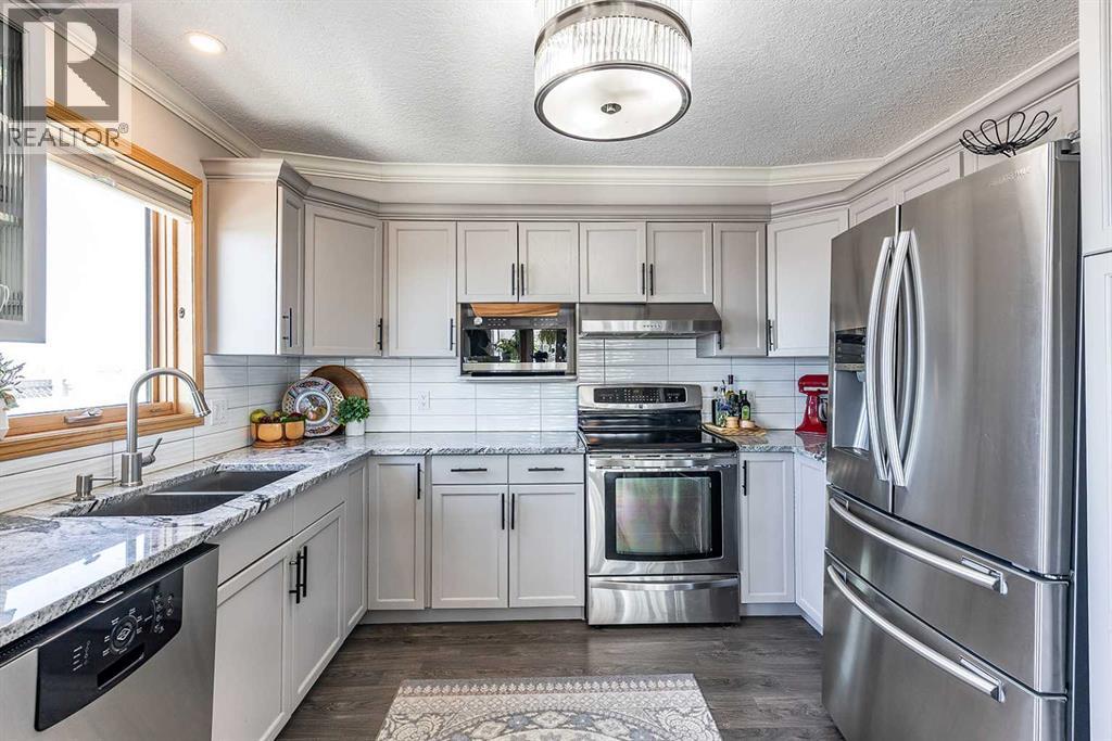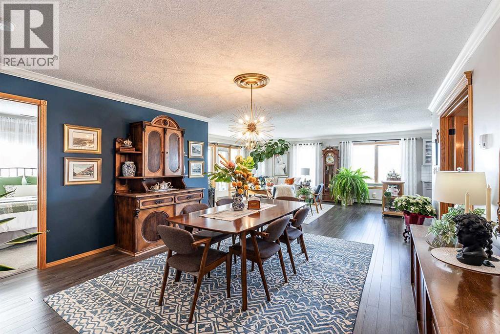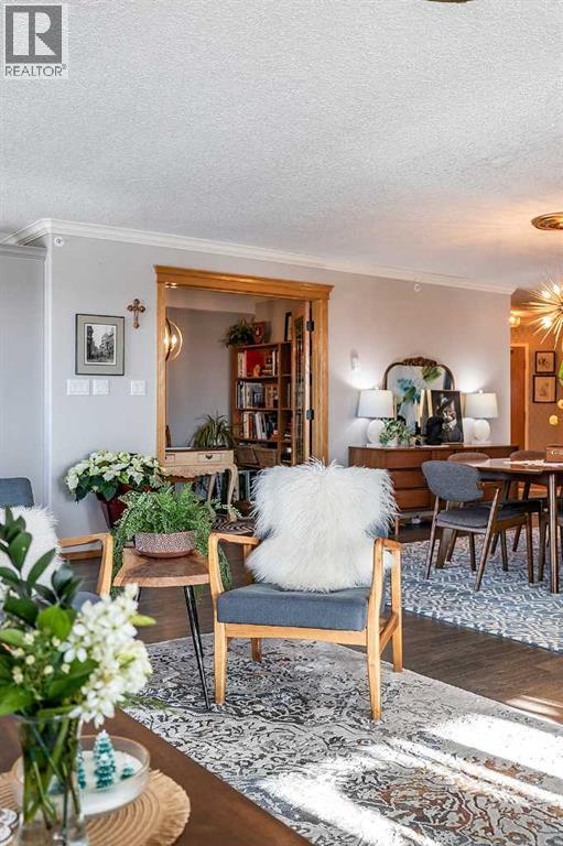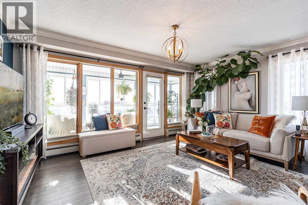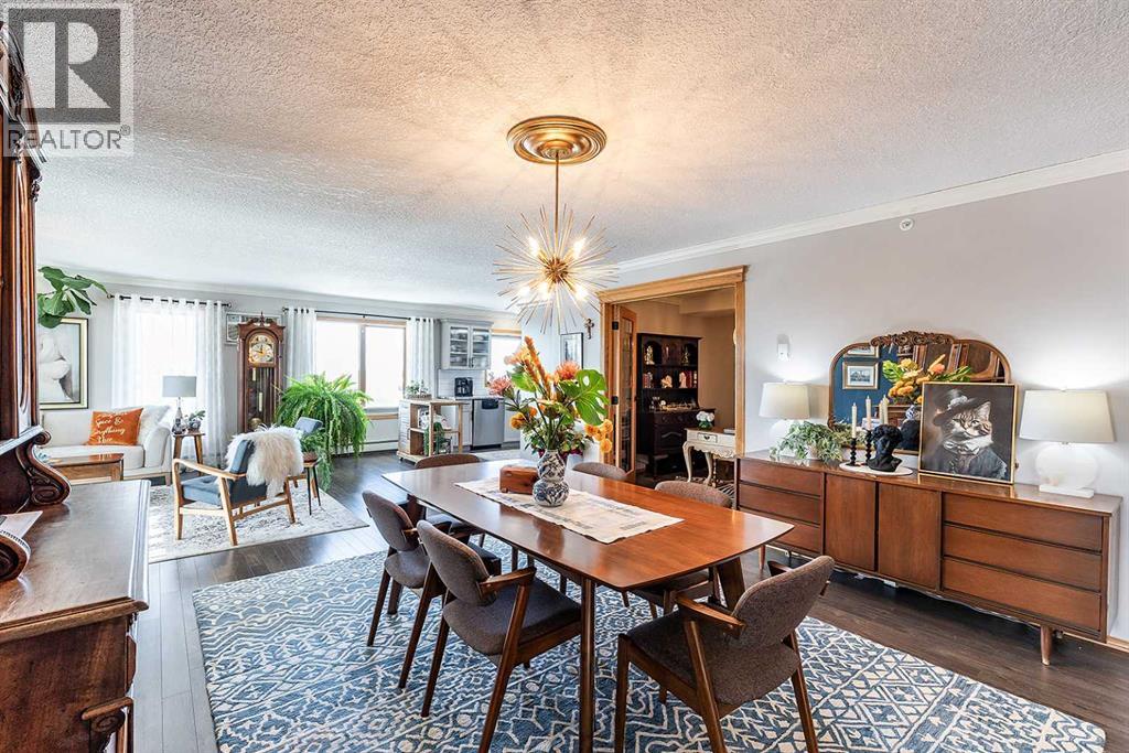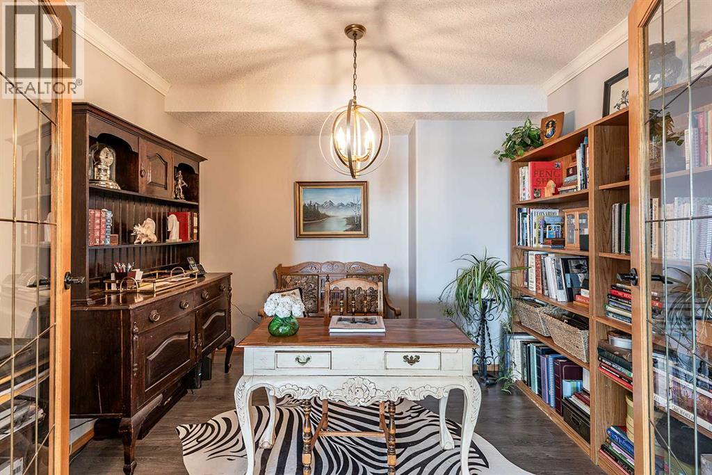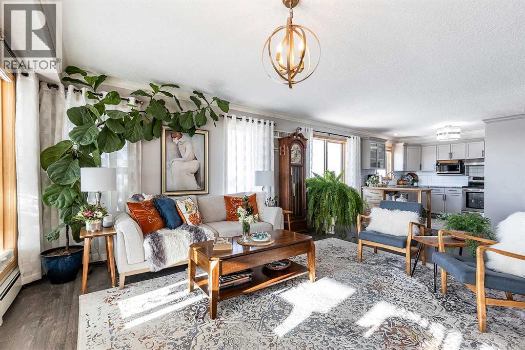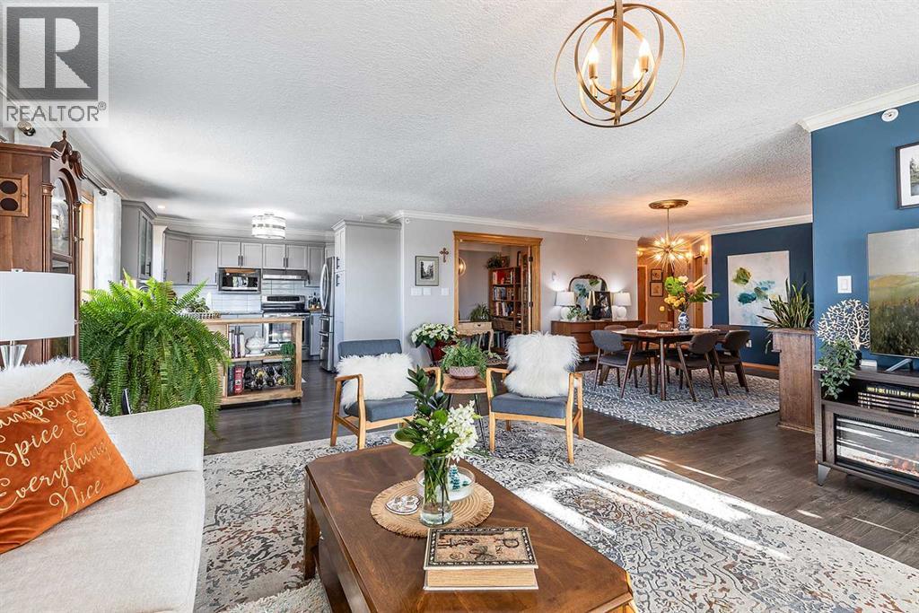 Welcome to this beautifully updated top-floor, corner unit in the sought-after Grandview Village, where thoughtful design meets elevated style. With desirable west-facing exposure, this home is filled with natural light, creating a warm and inviting atmosphere from the moment you step inside. Completely move-in ready, this home has been enhanced with fresh paint, elegant crown moulding, and updated lighting throughout, adding a refined and polished feel. The open-concept living, dining, and kitchen layout is ideal for both everyday living and entertaining. There is ample space for a full-sized dining table, while the generous living room flows seamlessly onto a private enclosed deck—an extension of your living space and the perfect place to relax and enjoy stunning sunsets. The renovated kitchen features a neutral gray cabinetry, granite countertops, and a stylish tile backsplash, offering both beauty and functionality. Just off the dining area is a versatile den, ideal for a home office, library, music room, or even a guest space. This well-designed condo offers two spacious bedrooms, including a primary retreat complete with a walk-in closet and a 3-piece ensuite featuring a jetted tub, updated countertop, and backsplash. A second 3-piece bathroom, also refreshed with new countertop and backsplash, along with a convenient laundry room with sink and storage, completes the interior. Additional highlights include one underground parking stall and a large storage locker. Condo fees of $764.18/month and include all utilities and access to an impressive array of amenities: indoor pool and hot tub, fitness centre, car wash, guest suite, recreation rooms, RV/boat storage, and a workshop. An exceptional opportunity to enjoy carefree condo living in one of Medicine Hat’s most desirable age-restricted buildings—this home truly has it all. (id:55690)