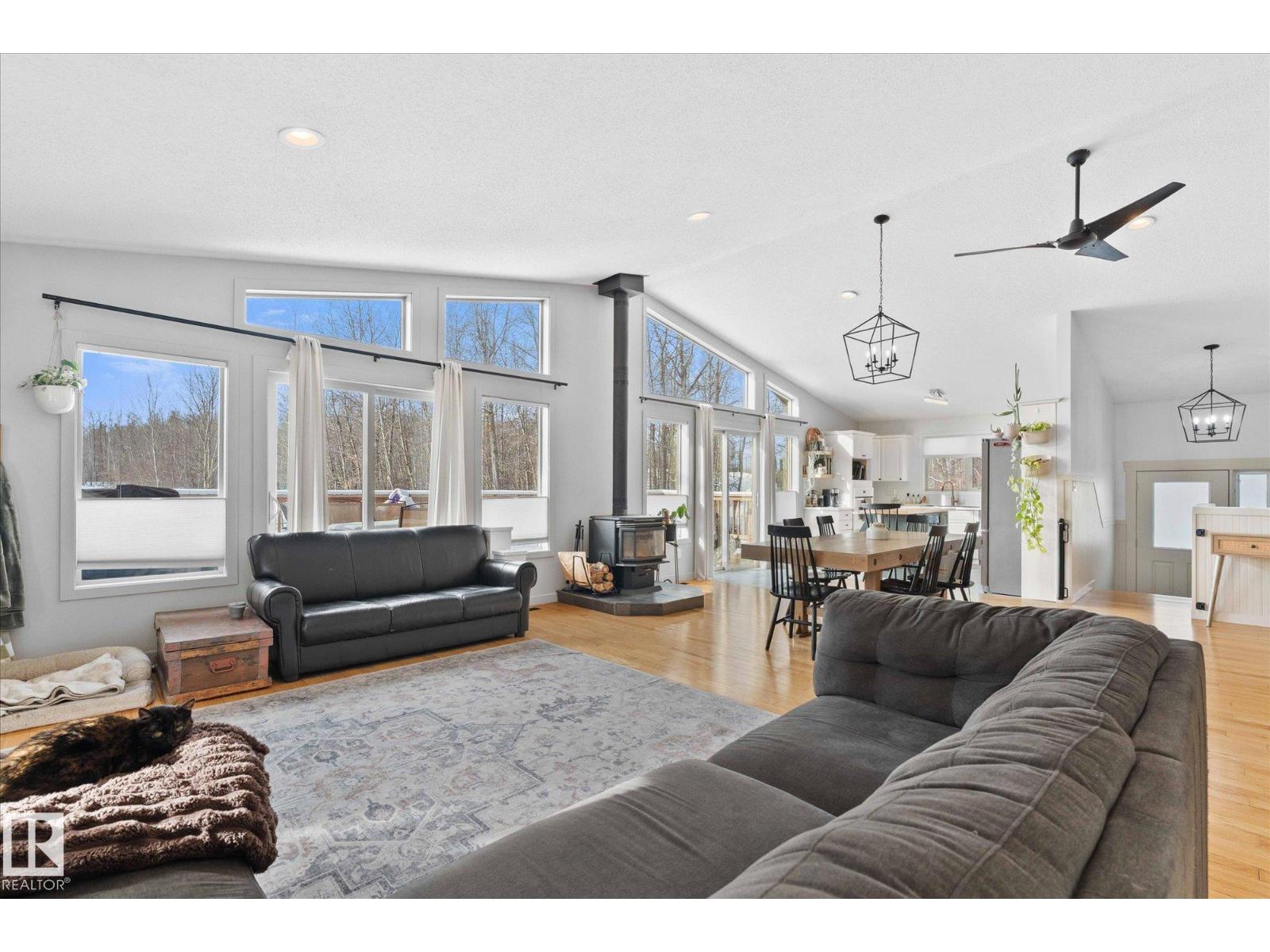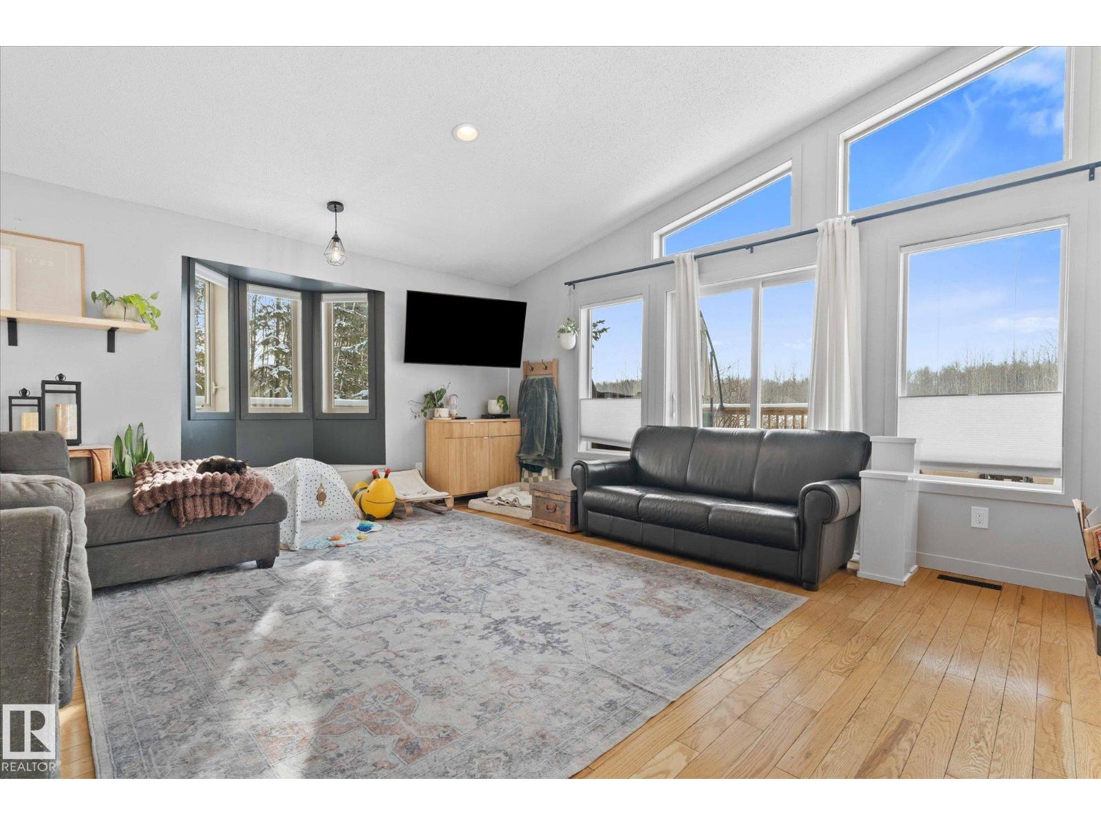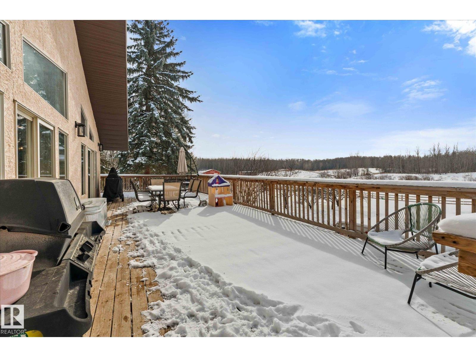 It's time for your hobby farm dreams to come TRUE! Nearly 20 acres OUTSIDE of subdivision with ROLLING hills, mature trees, large quonset shop (~4400 sq/ft), fencing, 15x200 pole barn, insulated 6-stall barn, 2 waterers, outbuildings and BEAUTIFUL 4 bdrm, 3 bathroom home! This incredible property is ready for you to enjoy peace and quiet with NO neighbours only 35 minutes west of Edmonton! The bright walkout bungalow has 3 bedrooms upstairs, including a large 4-pc bath jack & jill style with a 2-pc ensuite on the primary bedroom and walk-in closet. Main floor laundry and large spacious living room, dining room and kitchen with wood burning FP gives plenty of space for the whole family. Walk straight out onto your large, south facing deck! The lower level has a large rec room, additional bedroom (just add a closet!), 3 pc bathroom and main cave/double HEATED garage with floor drain. 2009 HWT + Furnace. PLUS AC and Starling internet! Outside are plum and apple trees, and room for gardens. A real gem! (id:55690)
