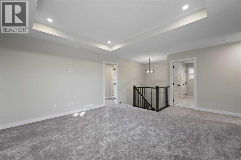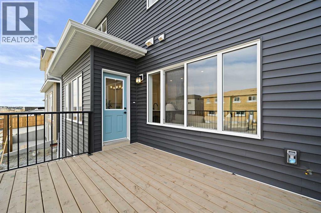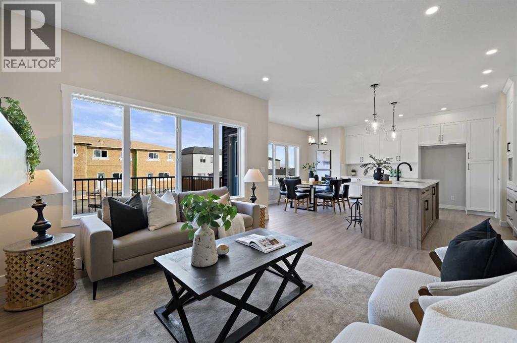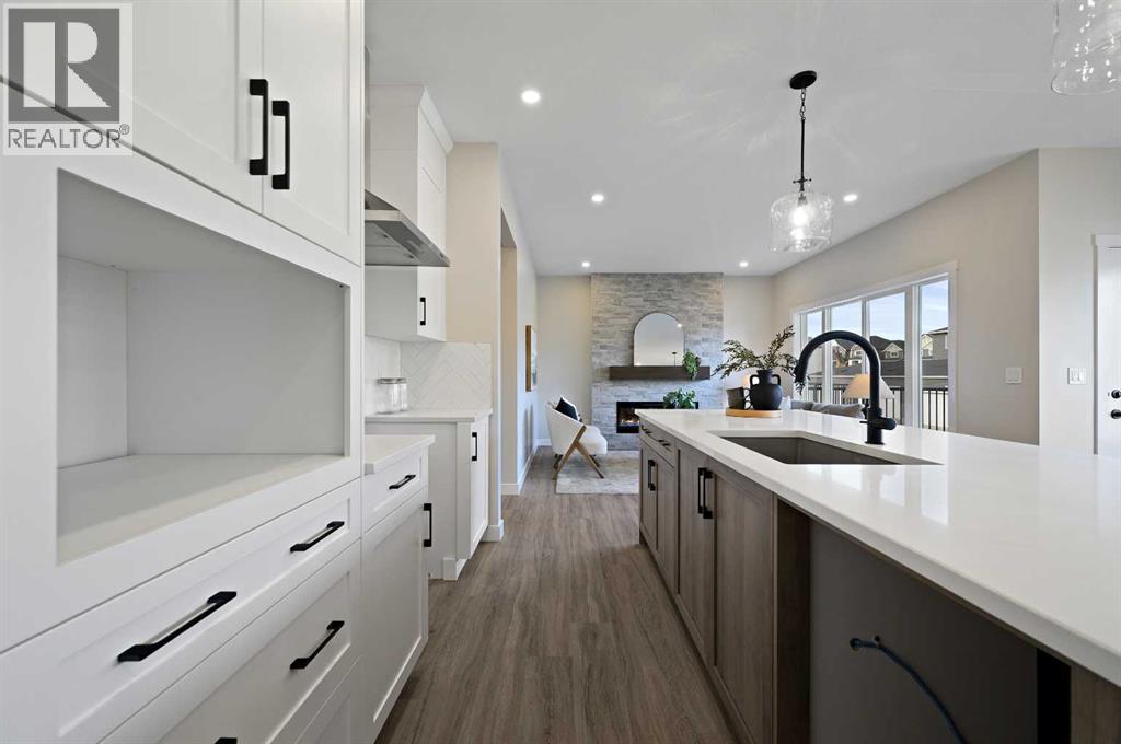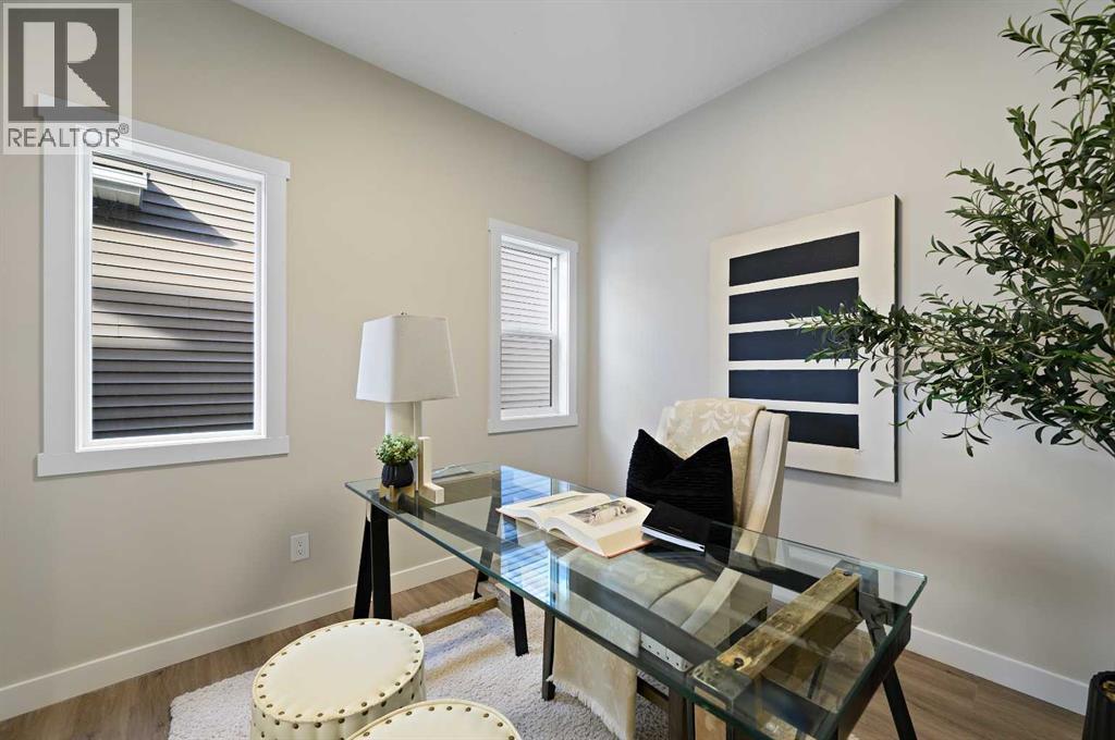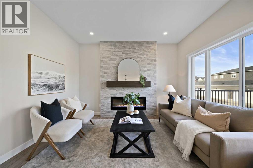 Genesis Builders presents the Ashdale, a thoughtfully designed 3 bedroom 2.5 bathroom home offering more than 2200 square feet along with a main floor office. Stepping inside, you are greeted by the warm ambiance of neutral tones and airy 9' ceilings. The luxury vinyl plank flooring guides you through the open concept main floor living space. The heart of the home is the chef’s kitchen with cabinetry finished in chantilly lace, accented by black and gold hardware, a wood grain island, a glossy white herringbone tile backsplash, and bright quartz countertops paired with a stainless steel appliance package. The open concept living area offers a generous dining room that flows into the living room and provides access to the north backyard where you will enjoy sunny evenings and beautiful sunsets. A stone faced feature fireplace anchors the living room and adds warmth and style. Complimenting the main floor is a private office, a powder room, and a convenient walk through pantry from the mudroom that connects to the double attached garage. Upstairs, a central bonus room with a tray ceiling greets you and separates the primary bedroom from the second and third bedrooms. The primary bedroom is a spacious retreat with an ensuite bathroom that includes double sinks, an oversized tiled shower, and a large walk in closet. The additional bedrooms are generous in size and function perfectly for kids or guests. A beautifully finished full bathroom and a laundry room complete this floor. The basement is a blank canvas with upgraded 9' ceilings and awaits your design ideas. Situated in the desirable bayview community, this family friendly neighborhood offers endless ways to get outside. You are steps from Nose Creek Elementary School, the pathways that wind along the scenic canals, a new playground, and so much more. *Area size was calculated by applying the RMS to the blueprints provided by the builder. (id:55690)