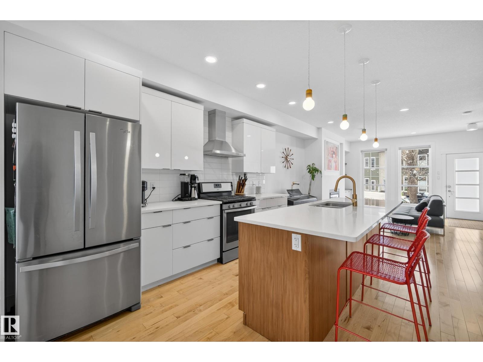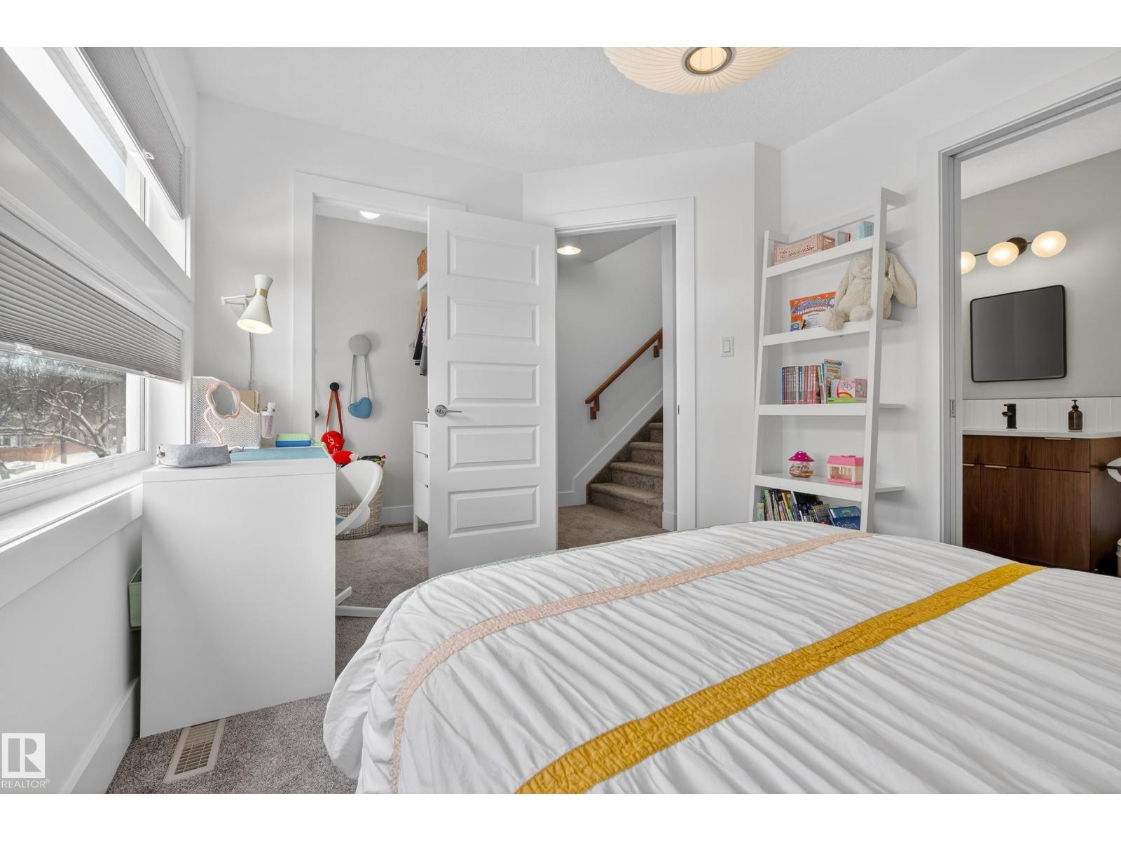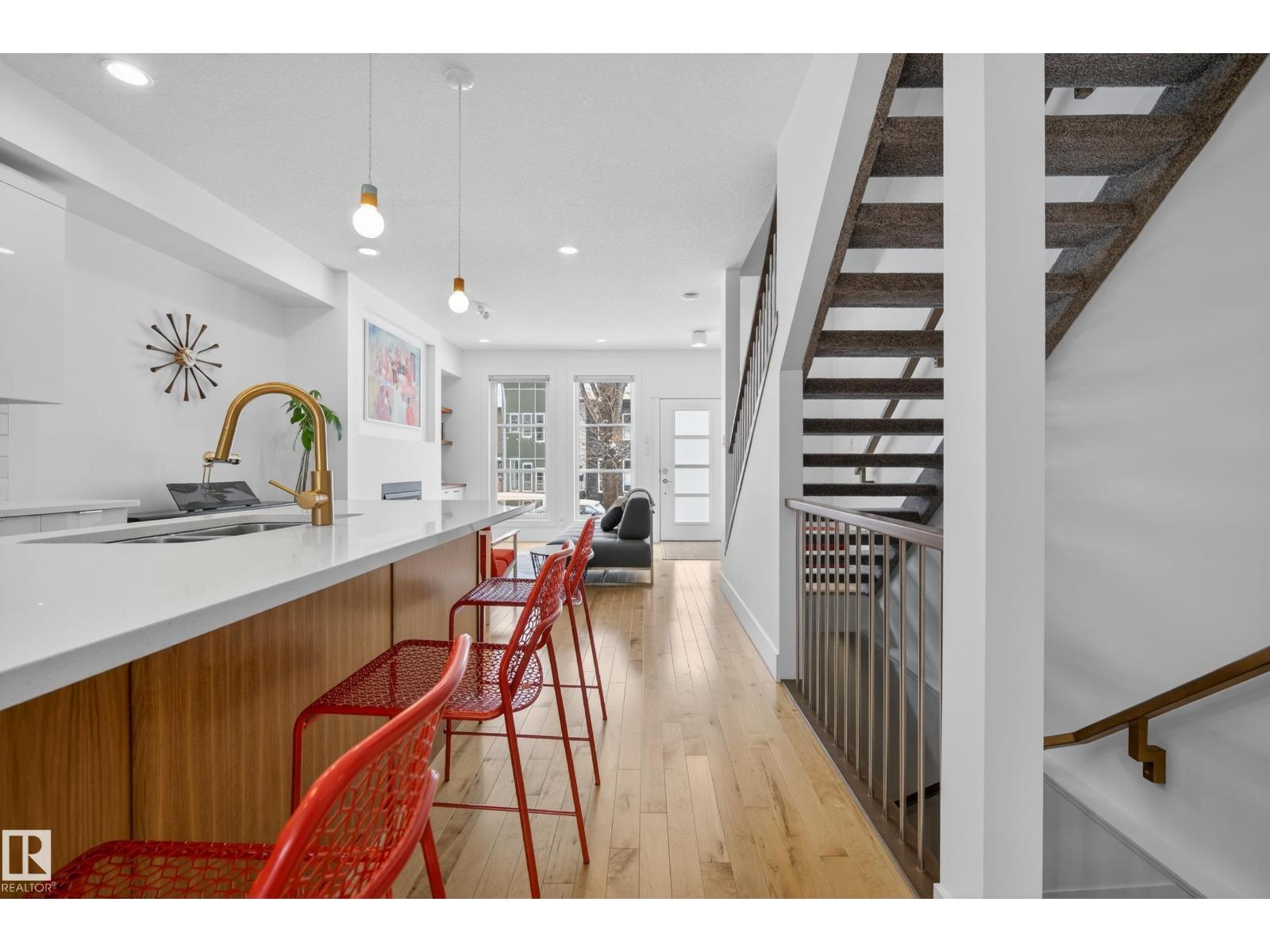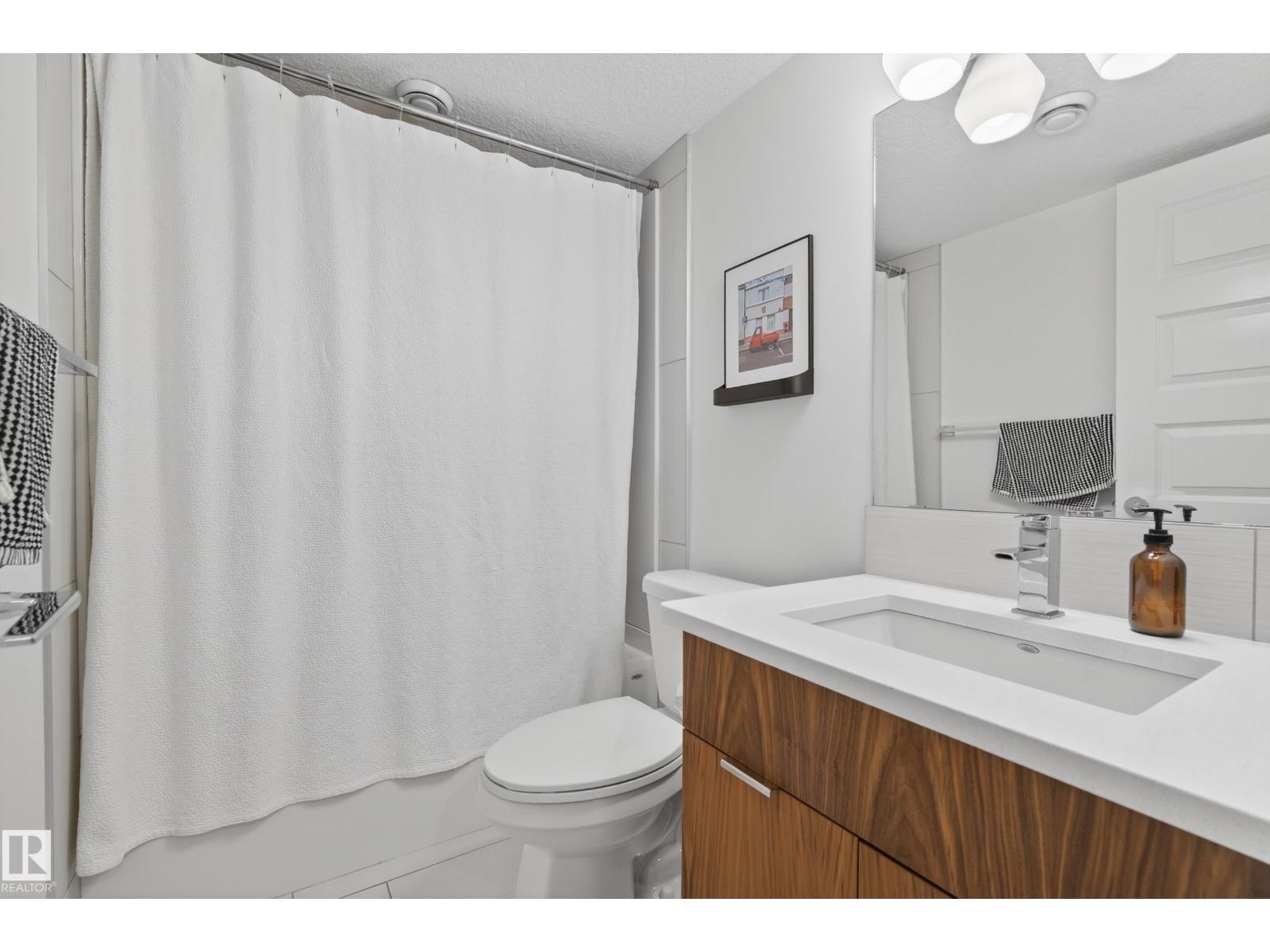 Welcome to this stunning 3-storey townhouse offering the perfect blend of modern style and functional living! The bright main floor features hardwood floors, a cozy gas fireplace, and an open-concept layout connecting the living, dining, and kitchen areas. The kitchen boasts quartz countertops, stainless steel appliances, a spacious dining area, and a convenient 2-piece bath. The second level offers two generous bedrooms, each with its own ensuite, plus a dedicated laundry space with updated cabinetry. The third floor features a private third bedroom and access to your own rooftop patio—perfect for relaxing or entertaining. The fully finished basement includes a rec room, 4th bedroom, and full bathroom. The garage is equipped with power for EV charging, and you’ll love the beautifully landscaped common yard. Ideally located within walking distance to Mill Creek Ravine, Bonnie Doon Shopping Centre, La Cité Francophone, and Colombian Coffee, this home offers incredible value in a prime location! (id:55690)