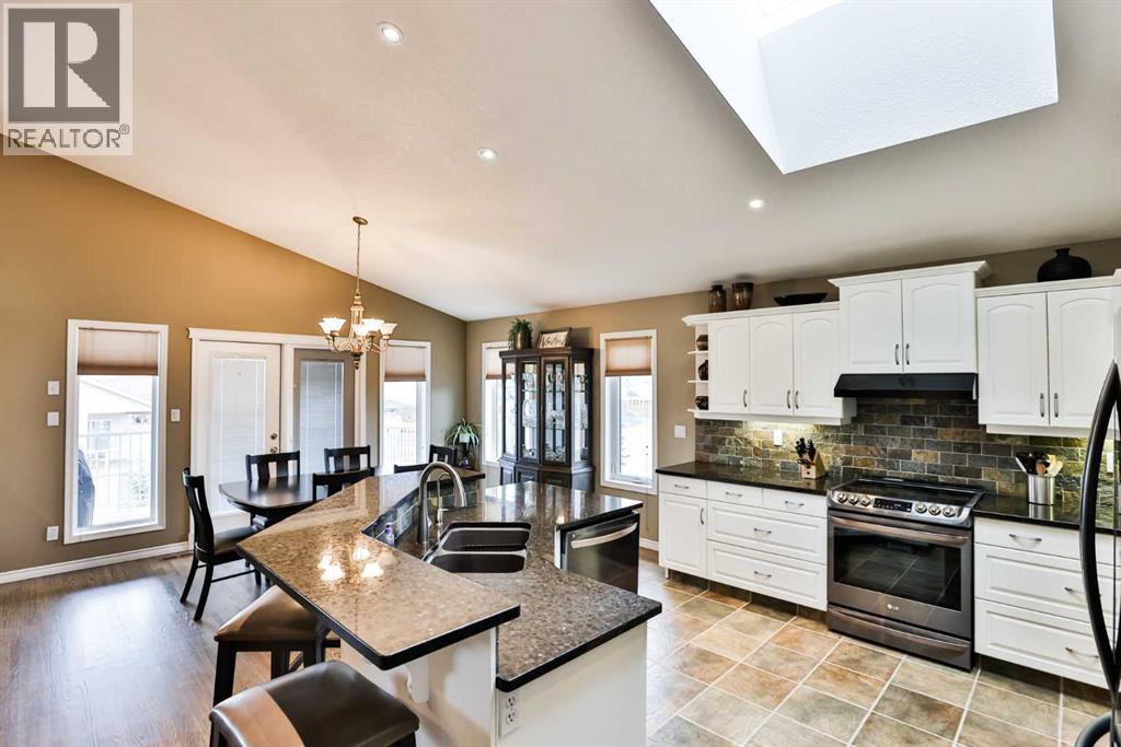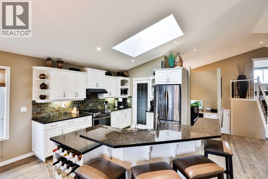 Tucked away in a quiet cul-de-sac in the highly sought-after community of Heritage, this beautifully maintained bi-level walkout offers over 1,700 sq. ft. of thoughtfully designed living space across the main floor and above the garage. Set on a massive lot backing onto serene green space, this property delivers the perfect combination of privacy, comfort, and everyday functionality.Step into a spacious front entry and head up to a warm, inviting living area featuring rich hardwood flooring, a striking three-sided fireplace, and expansive windows that flood the home with natural light. In-floor heating throughout all tiled areas—including the basement—adds an extra layer of comfort year-round.The kitchen and dining area were stylishly updated in 2020 with new countertops, appliances, freshly painted cabinetry, modern lighting, and refinished hardwood floors—blending contemporary updates with timeless charm. A large pantry, built-in desk space, and an impressive 4’ x 4’ skylight enhance both functionality and brightness.With four generously sized bedrooms, there’s ample space for family and guests. The private primary retreat above the garage is a true highlight, featuring a spacious walk-in closet and a luxurious ensuite complete with an air tub, steam shower, and additional linen storage. Downstairs, 9-foot ceilings and oversized walkout windows create a bright, open lower level that feels anything but below grade.Outdoor living is equally exceptional, offering a covered patio with durable vinyl decking, stairs to the yard, and a gas line for effortless BBQ setup. The expansive backyard is ideal for entertaining or relaxing, with mature trees for added privacy, rock waterfall feature, underground sprinklers, and plenty of space for a future firepit area.Additional features include a new roof (2020), exposed aggregate driveway, stucco exterior, plush carpeting, window blinds, reverse osmosis system, zoned in-floor heating, an oversized 23’ x 25’ double attached garage, and a convenient side shed for extra storage.Located in an established neighbourhood known for its mature trees and close proximity to amenities, this exceptional home offers space, style, and a truly unbeatable setting. (id:55690)